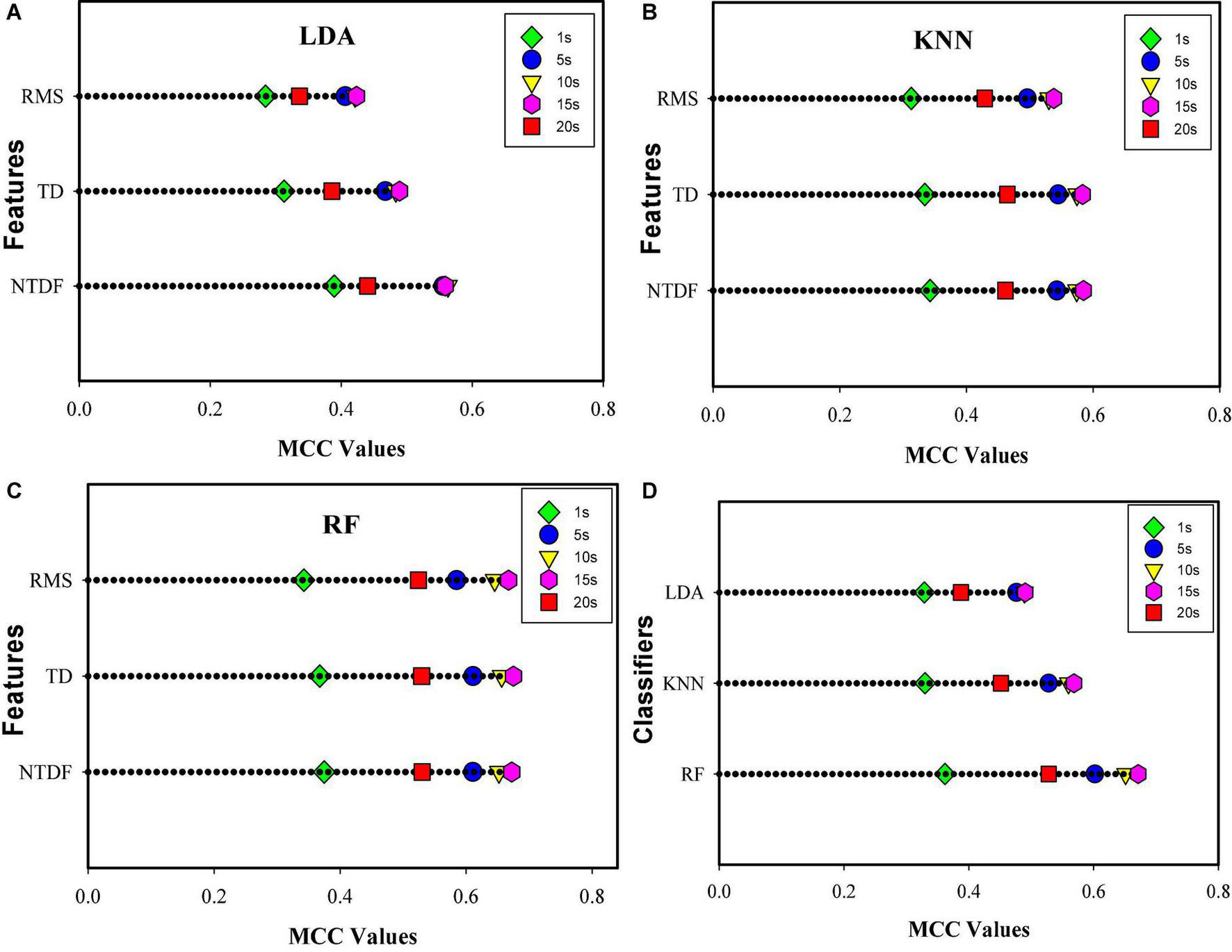 Using the same number of classifiers and features, the obtained average MCC value across all the finger motion tasks and subjects is shown in Figures 5A–D using horizontal dot plots. Inspecting each of the classifier-feature combinations (Figures 5A–C) for all the SRD groups, NTDF yielded the highest MCC values for LDA and similar values with TD4 for KNN and RF. Meanwhile, the RMS feature has the lowest MCC values for the different groups of signal recording lengths investigated.