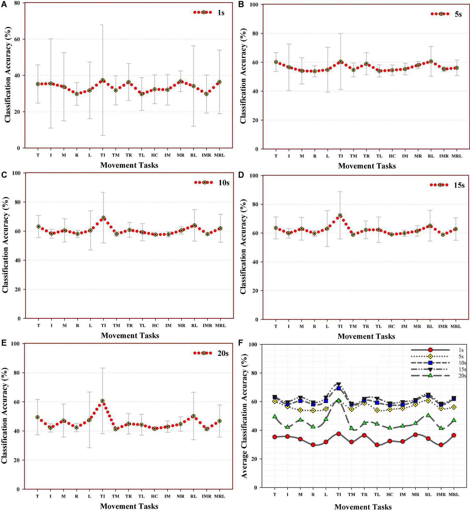 Average decoding performance across subjects for individual finger gesture using the combination of NTDF feature and LDA classifier for (A) 1 s, (B) 5 s, (C) 10 s, (D) 15 s, and (E) 20 s, (F) multiple splines curve lines and scatter plot showing performance comparison among the motion classes.