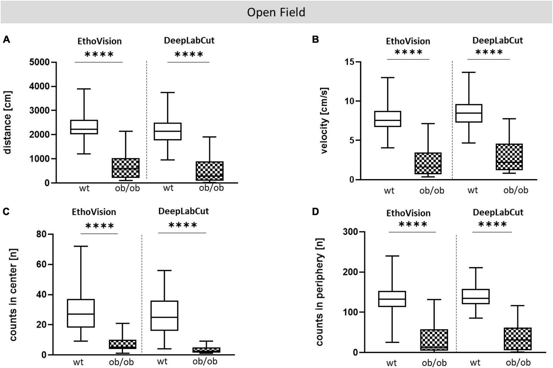 Comparative analysis with EV and DLC for OF test. OF analysis of wt and ob/ob mice. (A) Moved distance (cm), (B) mean velocity (cm/s), (C) number of visits (counts) in center (n), (D) number of visits (counts) in periphery (n). Significance of differences between the groups were tested by unpaired Student’s t-test. Group size was as follows: n(wt) = 36(EV) or 35(DLC), n(ob/ob) = 40 [EV (A,B,D)] and 39 (C) or 38 [DLC (A,B,D)] and 34 (C). Statistical significance was set at ****p < 0.0001. EV, EthoVision; DLC, DeepLabCut.
