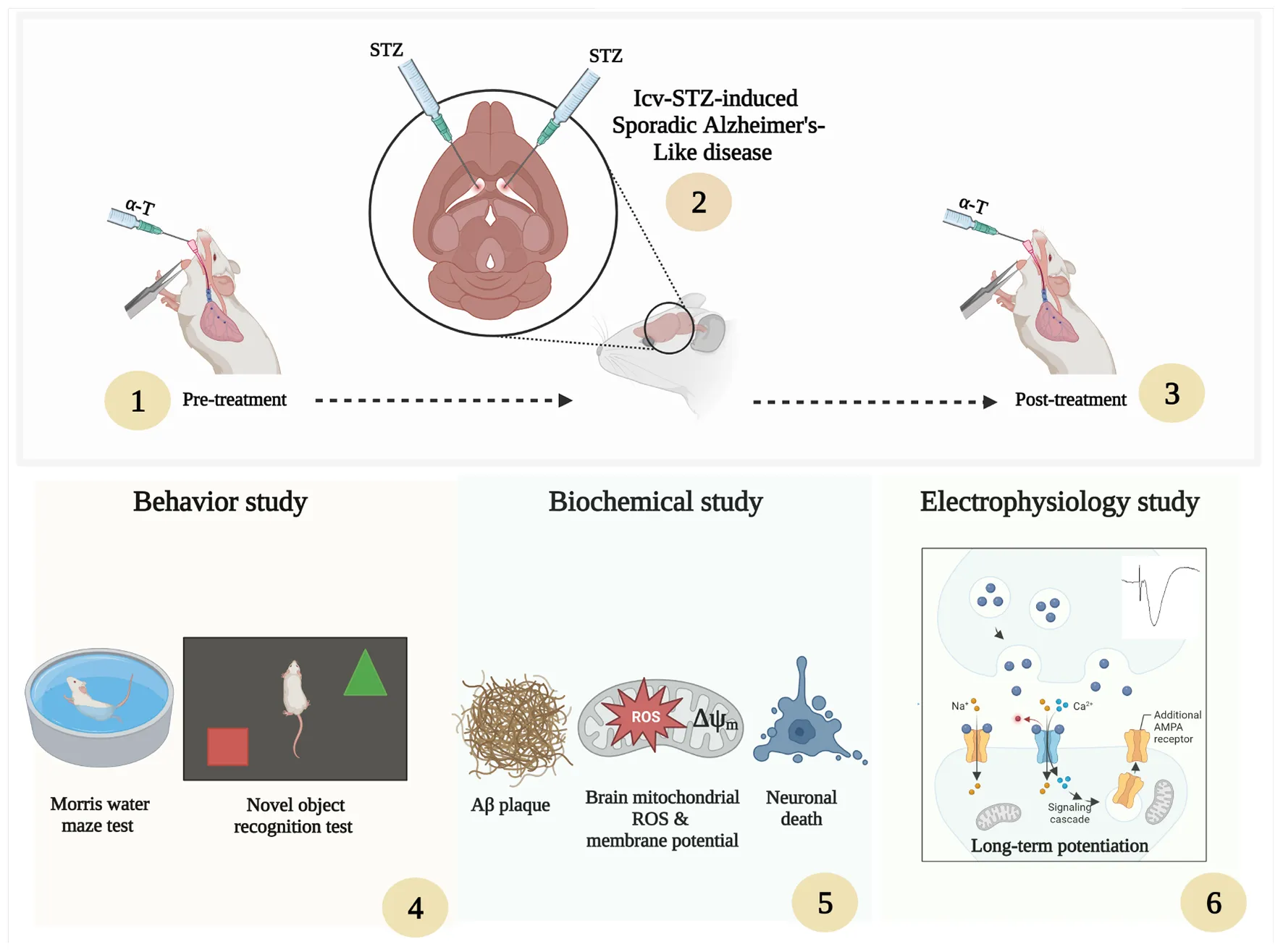 Male Wistar rats were pre-treated with (α-Tocopherol 150 mg/kg) orally once daily for 7 days before and 14 days after being bilaterally injected with icv-STZ (3 mg/kg), while sham group rats received the same volume of STZ solvent. After 2 weeks of icv-STZ infusion, rats were tested for cognitive performance using a behaviors test and then were prepared electrophysiology recordings or sacrificed for biochemical and histopathological assays.