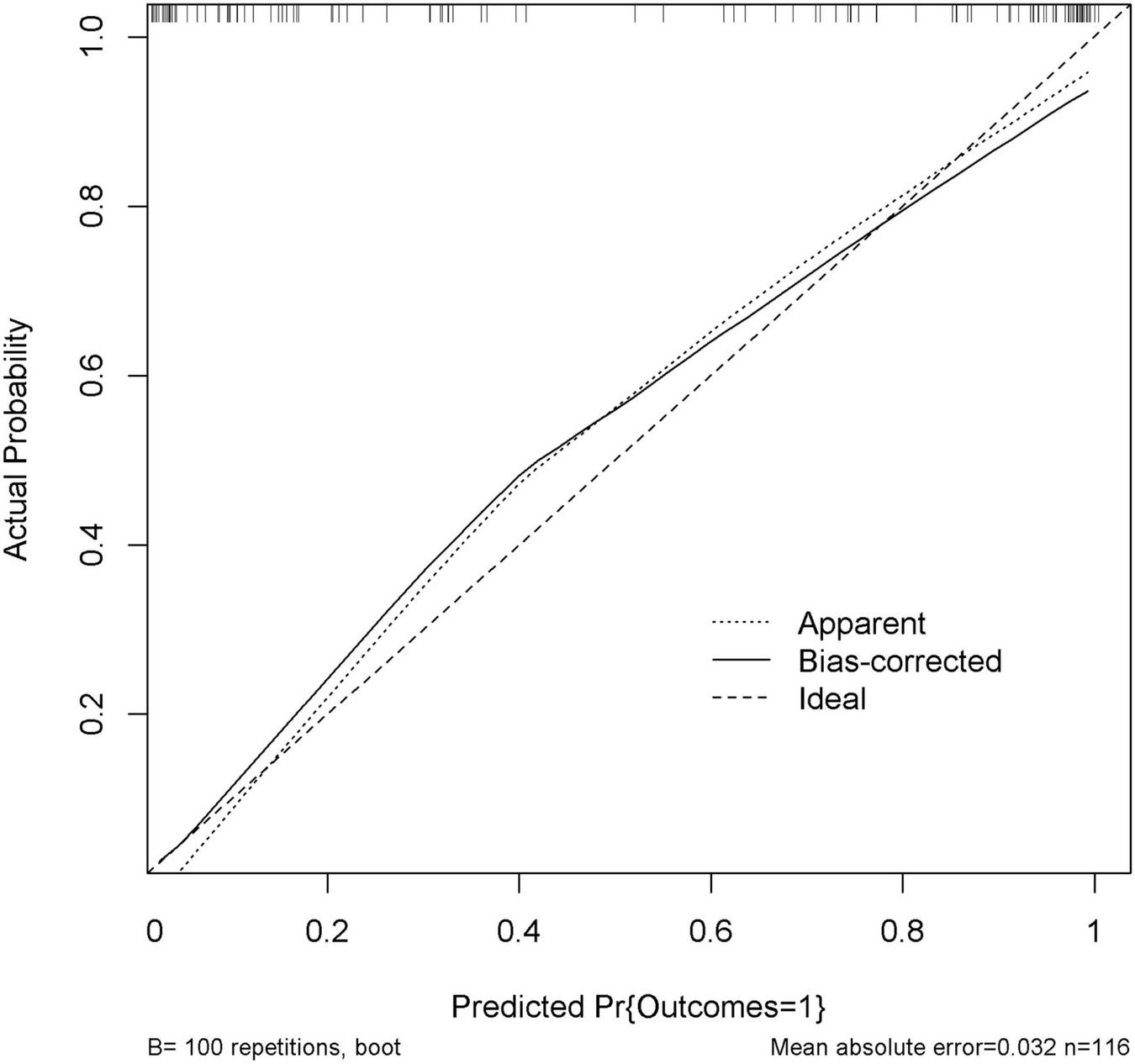 Calibration curve of the nomogram. Internal validation was performed using the 100 bootstrap resampling method. The predicted probability and the actual probability are presented by the X and Y axes, respectively.