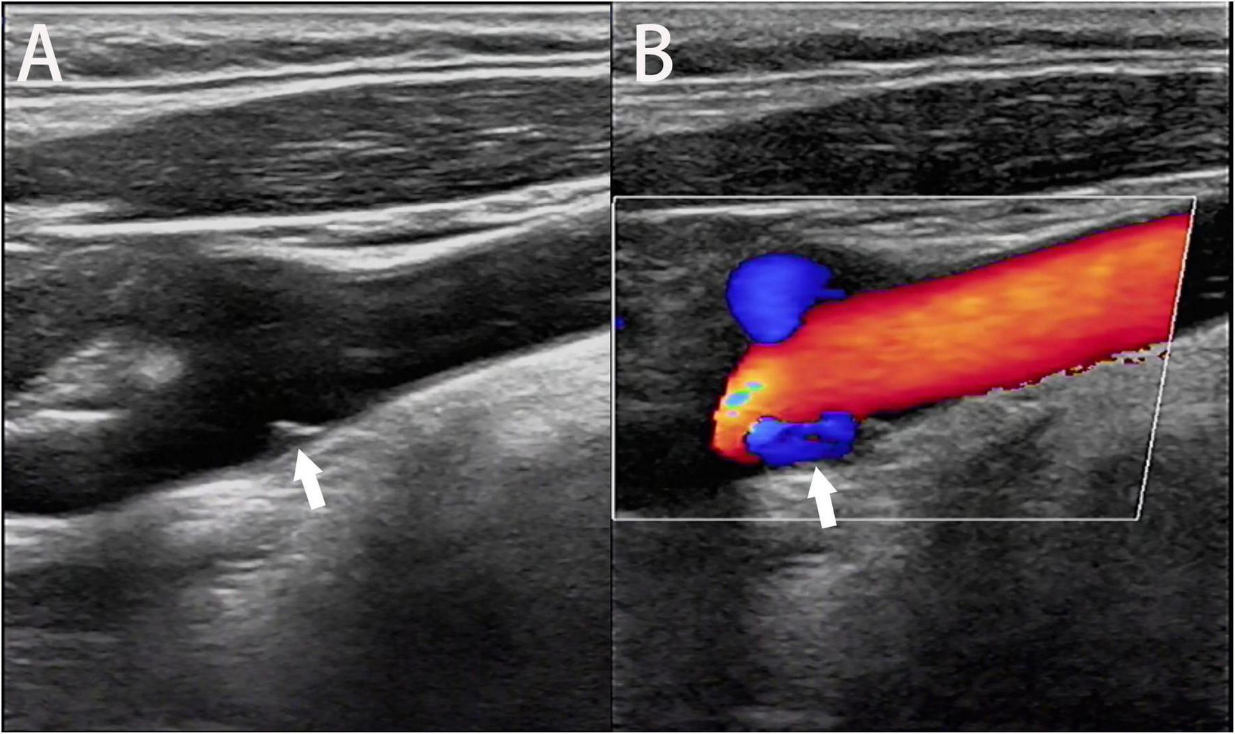 Ultrasonic image of the longitudinal section shows the carotid web extending into the lumen of the carotid bulb (A, arrow). An eddy current is generated at the angle between the carotid web and the artery wall on the color Doppler flow image (B, arrow).