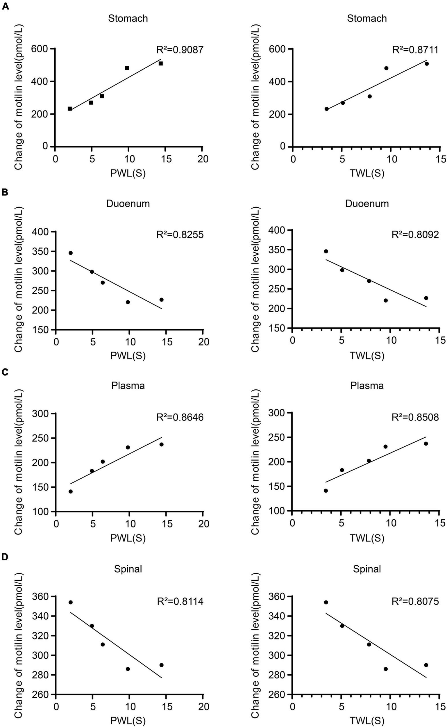 Figure 5. Regression curves of the correlation between mechanical withdrawal threshold (MWT) measured as paw withdrawal latency (PWL) and thermal withdrawal latency (TWL) and motilin (MTL) expression in (A) gastric body, (B) duodenum, (C) plasma, and (D) spinal cord in rats with incisional pain.