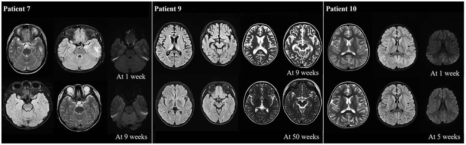 The MRI results showed that most of the patients (10/13) exhibiting different abnormalities (Table 1). An abnormal signal appeared in the bilateral frontal lobe and left temporal lobe cortex, and subcortex of P7 at one week after onset. The left temporal cortex and subcortical abnormal signal range were significantly reduced at 9 weeks after onset compared with onset. P9 presented with bilateral thalamus and right hippocampus on admission, with the possibility of viral encephalitis. The cerebral sulcus fissure was slightly broader and deeper, and the bilateral lateral ventricles were slightly enlarged at 9 weeks after the disease onset (following immunotherapy with methylprednisolone). The abnormal signal was absorbed, and the sulcus fissure and bilateral ventricle were slightly less at 50 weeks after onset than at 9 weeks after onset. P10 had multiple T2 abnormal signals in the head of the bilateral caudate nucleus, bilateral frontotemporal parietal, and occipital cortex at one week after onset. FLAIR showed hyperintensity, and limited diffusion. Most lesions in the head of the bilateral caudate nucleus, bilateral frontotemporal parietal-occipital cortex and diffusion-limited lesions were smaller at 5 weeks after onset than at one week after onset (Figure 5).