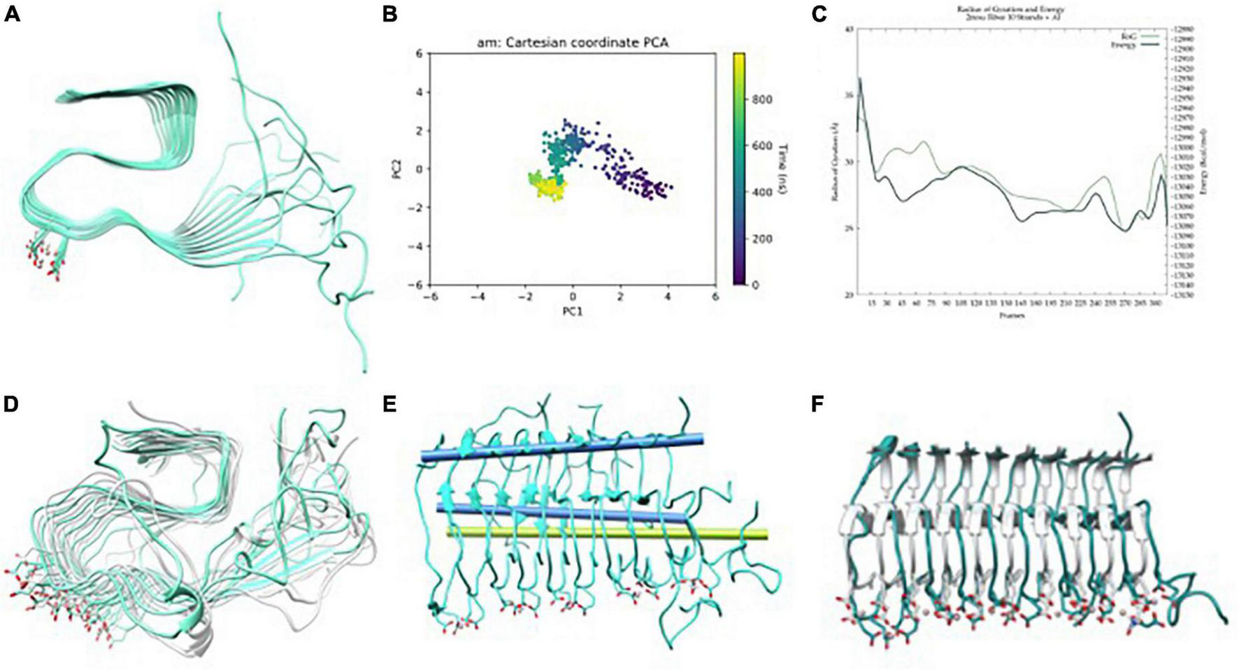 (A) Aβ42-Al(III) model, (B) principle component analysis (PCA) of Gaussian accelerated molecular dynamics (GaMD) simulation, (C) energy profile and radius of gyration (RoG) along the GaMD simulation, (D) overlap of representative structures of most populated clusters obtained from GaMD simulations, (E) in blue, axis representation of 39–41 residues (top) and 13–15 residues β-sheets (bottom); in green; 13–16 β-sheets axis of NMR-structure, and (F) overlap between the solid-state NMR (ss-NMR) structure and the lowest energy structure of the GaMD simulation.