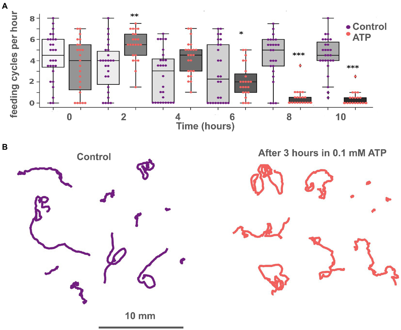 ATP exhibits long-term suppression of feeding and does not affect locomotion. (A) Bar chart of feeding activity of Trichoplax on green algae biofilms in normal conditions and with 0.1 mM ATP. Adding ATP to the dish with green algae increases ‘feeding’ activity at first and decreases after 6 h. In the experimental dish, ATP was added at 2 h. Asterisks denote a significant difference in feeding activity from the control (Welch t-test, *p < 0.05, **p < 0.01, ***p < 0.001). N animals = 37 and 28 for ATP and control, respectively. (B) Tracks of animals incubated in 0.1 mM ATP for 3 h (right) and in control (left). No significant differences in track length, straightness, or displacement were found.