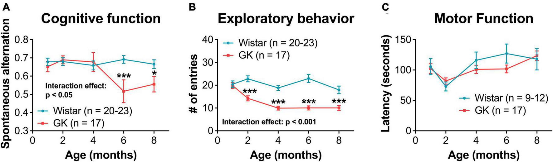Goto-Kakizaki rats exhibit cognitive and exploratory behavior deficits, but not motor function deficits. (A) Cognitive function at 1, 2, 4, 6, and 8 months of age as measured by spontaneous alternation on Y-maze. (B) Exploratory behavior at 1, 2, 4, 6, and 8 months of age as measured by # of entries on Y-maze. (C) Motor coordination as measured by rotarod latency. *p < 0.05, ***p < 0.001. Results expressed as mean ± SEM.
