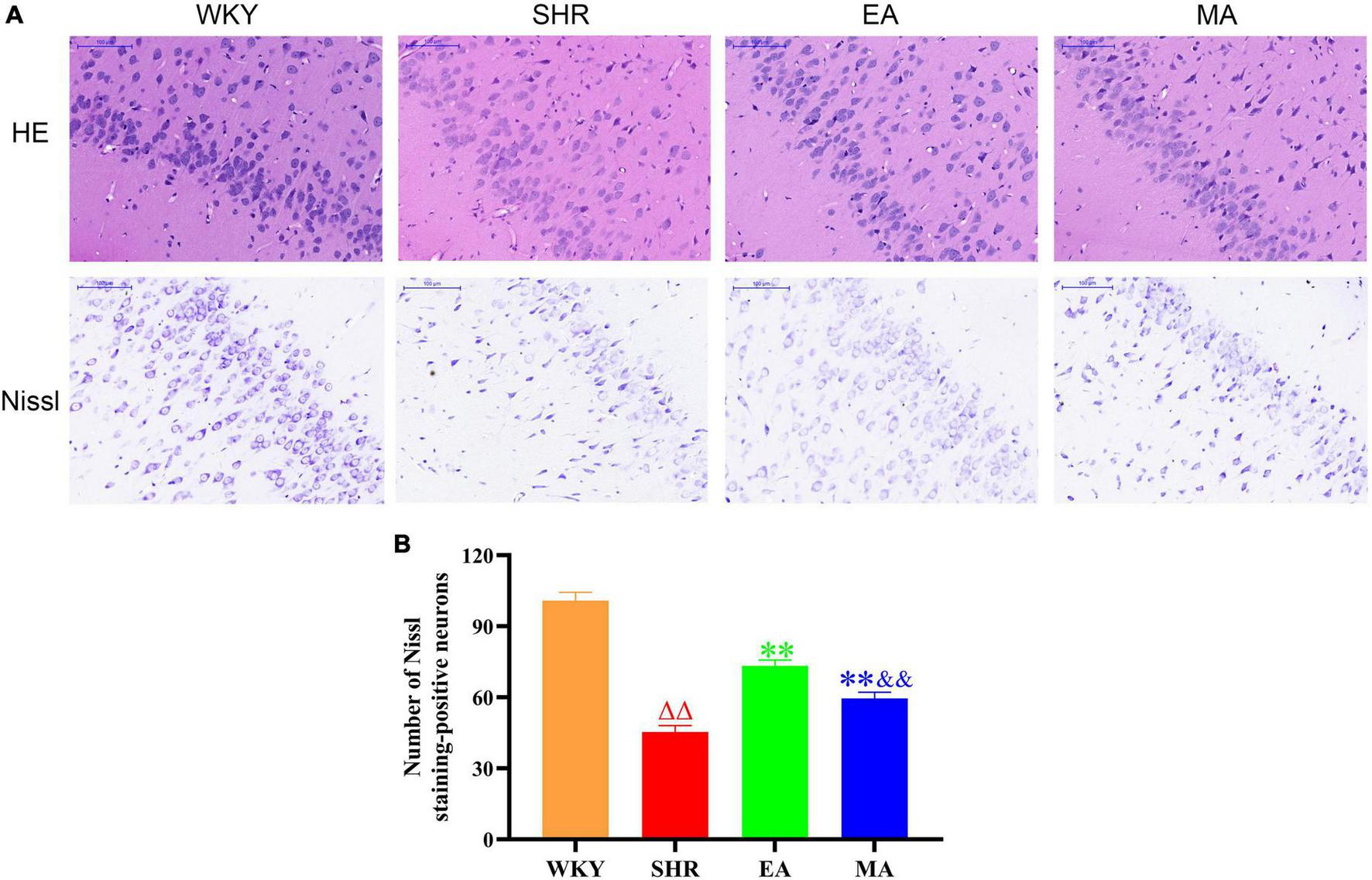 Electroacupuncture and manual acupuncture ameliorate neuronal injury in entorhinal cortex in spontaneously hypertensive rats (SHRs). The results of HE staining and Nissl staining in the entorhinal cortex. (A) Representative images of HE staining and Nissl staining in the entorhinal cortex of the Wistar–Kyoto (WKY), SHR, EA, and MA groups. Scale bar = 100 μm. (B) Quantitative evaluation of Nissl staining-positive neurons. Scale bar = 100 μm. The values are expressed as the means ± SEM (n = 3 rats/group). ΔΔp < 0.01 vs. WKY group; **p < 0.01 vs. SHR group; &&p < 0.01 vs. EA group. WKY, normal control group; SHR, model group; EA, electroacupuncture group; MA, manual acupuncture group.