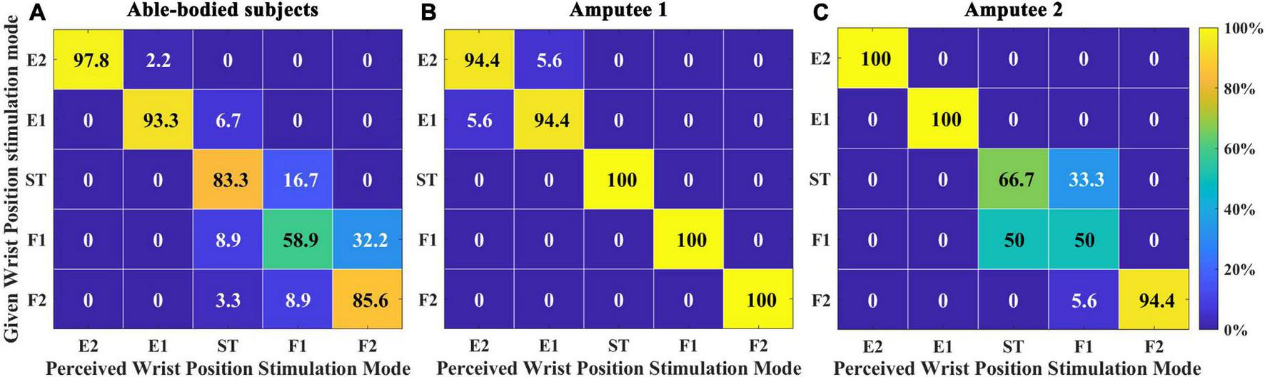 Confusion matrix quantifying the percentage of instances when comparing the perceived direction and range of wrist FE movements with the given stimulation in Exp 2. (A) Five able-bodied subjects. (B) Amputee 1. (C) Amputee 2. Confusion matrix quantifying the percentage of instances when comparing the perceived wrist movement stimulation mode with a given stimulation mode in Exp 2. (D) Five able-bodied subjects. (E) Amputee 1. (F) Amputee 2. The number in each rectangle represents the SR of the answer.