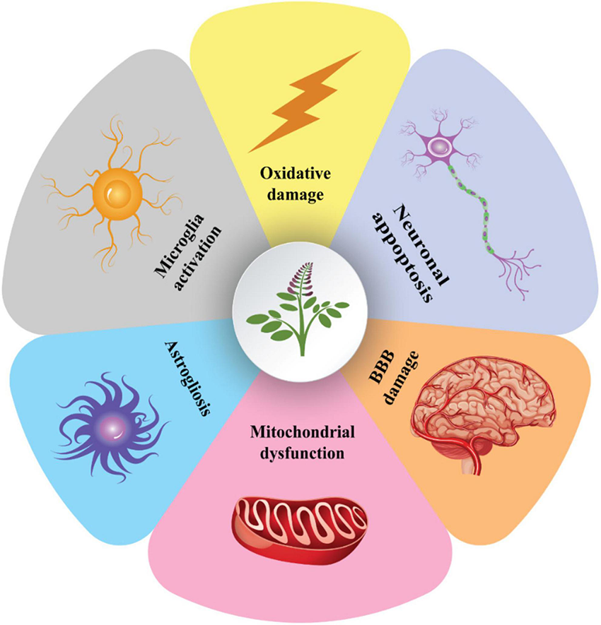 Ischemic stroke is one of the important causes of death worldwide, causing irreversible brain tissue damage. Current ischemic stroke mainstay therapy includes blood supply recovery, however, blood supply reestablishment is not obtained during the golden time due to the patient’s late arrival or contraindications related to the use of endovascular and thrombolytic agents (Roaldsen et al., 2021). Various agents have been proposed to reduce ischemia-related neural tissue injury by inhibiting inflammatory and neurotoxic pathways (DeLong et al., 2022). Licorice-derived glabridin has substantially modulated the middle cerebral artery occlusion (MCAO)- induced cerebral injuries in rats and also in staurosporine-treated cultured rat cortical neurons. The results indicated that glabridin escalated the levels of endogenous antioxidants and prevents cellular apoptosis (Yu et al., 2008). It has been shown that post-treatment of the ischemic stroke mice with 125 mg/kg Glycyrrhizae Radix et Rhizoma was effective in cerebral infarction and inflammatory response by regulating the activation of microglia and astrocytes (Figure 2; Choi et al., 2022).