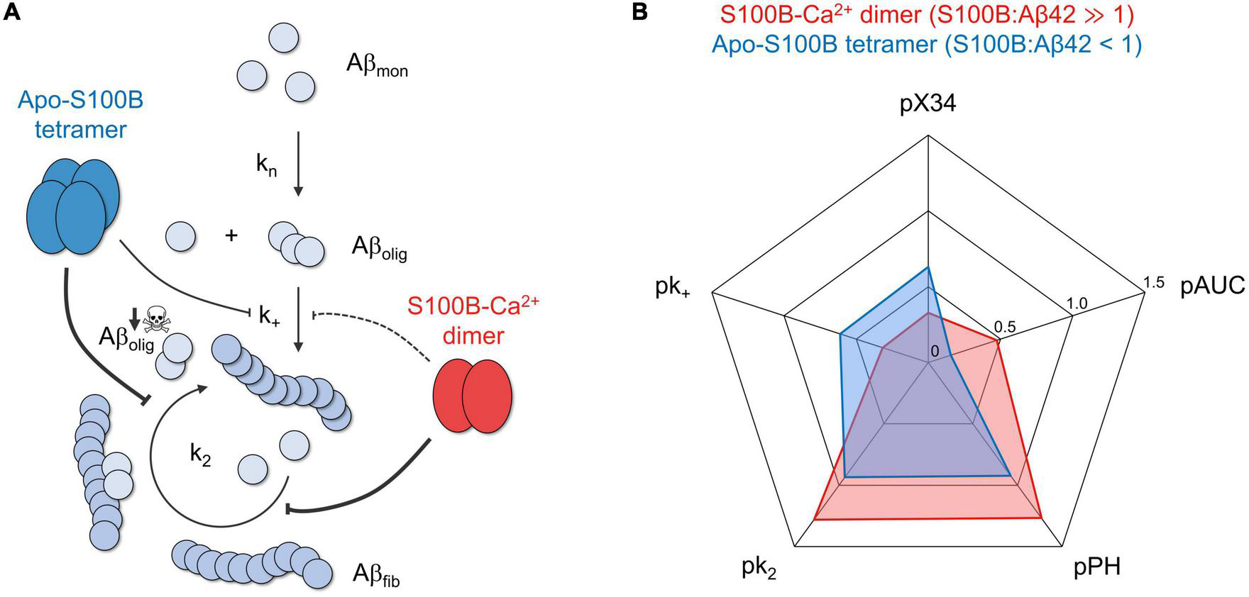 The chaperone activity of dimeric and tetrameric S100B suppresses the generation of intermediate oligomers during Aβ42 aggregation. (A) S100B dimer and tetramer suppression of Aβ42 oligomerization based on the discreetly distinct inhibition of multiple aggregation micro-steps and the preferential targeting of fibril catalyzed secondary nucleation. (B) Radar plot illustrating the complementary effect of dimeric (red) and tetrameric (blue) S100B, under the conditions tested, on the diverse parameters illustrating Aβ42 aggregation and oligomer formation: secondary nucleation and fibril elongation rate constants (k2 and k+, respectively), maximum oligomer influx and total number of oligomers (measured, respectively, by peak height, PH, and area under the curve, AUC, of Aβ42 oligomerization distributions) and relative amounts of X-34 positive oligomers. To facilitate data comparison, each parameter was transformed by applying the operator p (–log10), such that a higher inhibition will result in a more eccentric point in the plot.