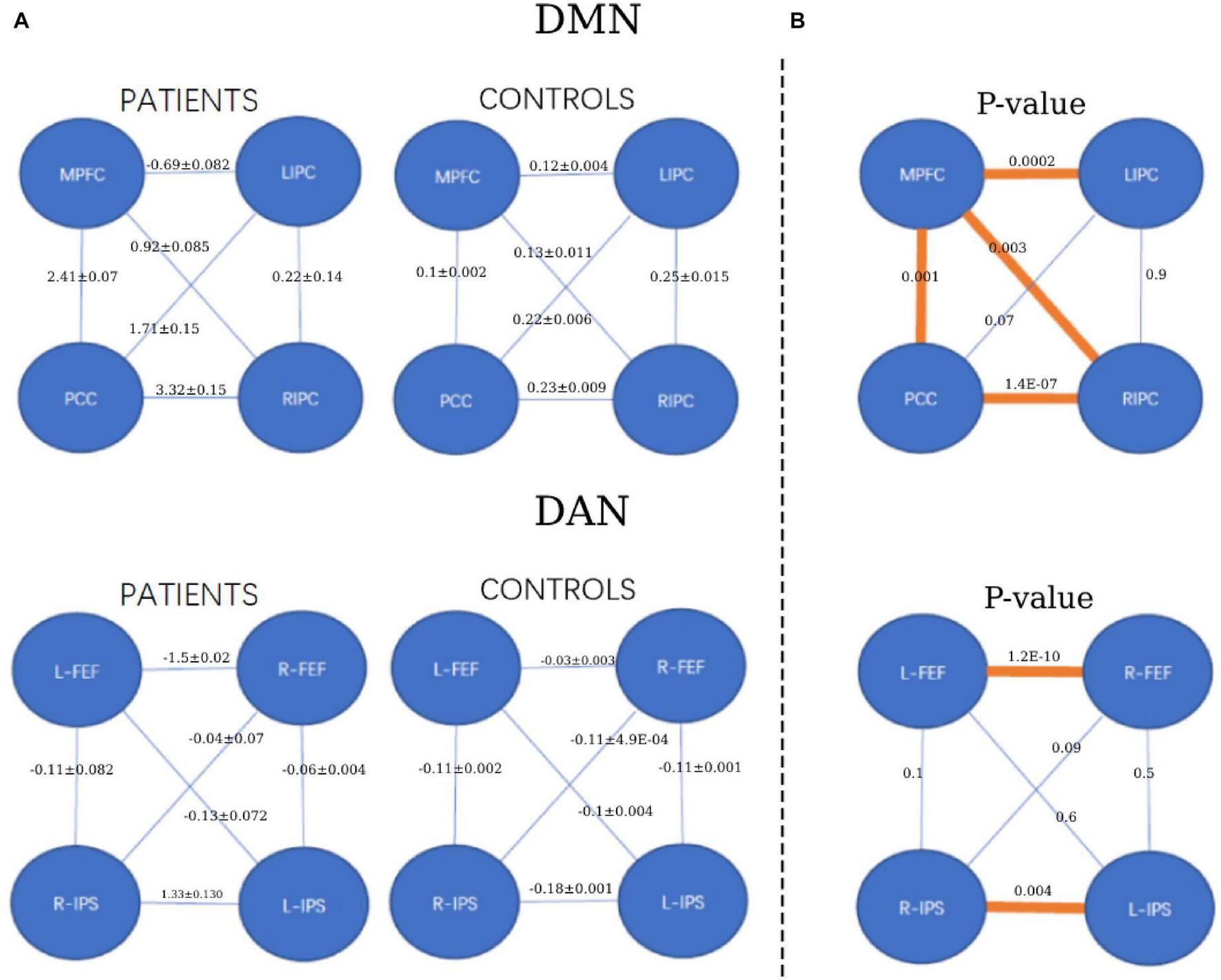Once the average connectivity values among the pairs of each region were estimated in DMN and the DAN, these values were subjected to a two-sample t-test to verify the difference in connectivity between the patient group and healthy controls.