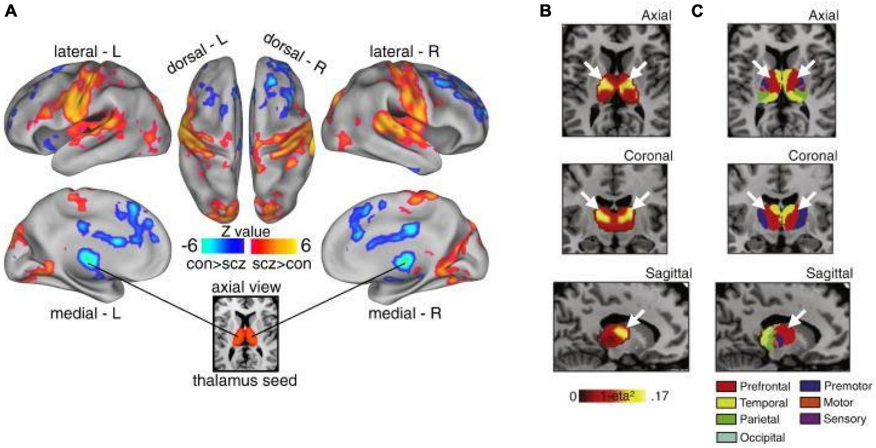 Thalamic dysconnectivity in SCZ. (A) Significant whole-brain between-group differences in thalamic connectivity between healthy controls (CON) and individuals with schizophrenia (SCZ). Red-orange (blue) foci mark areas where patients exhibited stronger (reduced) thalamic coupling. (B) Intrinsic thalamic dysconnectivity pattern based on group dissimilarity. The brightest voxels are associated with highest between-group differences. (C) Thalamus subdivisions based on the FSL thalamic atlas, defined by their connectivity to different regions of cortex. White arrows indicate the correspondence between thalamic regions with greatest dysconnectivity in SCZ and thalamic subdivisions strongly connected with prefrontal cortex (red). Adapted from Anticevic et al. (2014a).