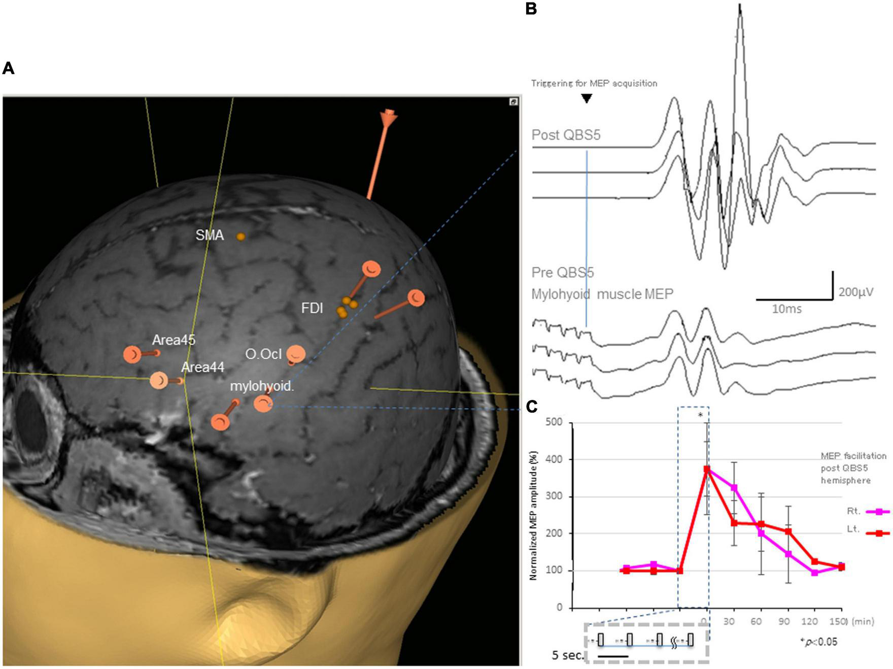 Representative MEPs following QPS recorded from the mylohyoid muscle and facilitation after QBS5 in a healthy control. (A) Target areas registered before mylohyoid and FDI mapping using the navigated brain stimulation (NBS) system [orange bars; mylohyoid, FDI muscle and orbicuralis oculi (O. Ocl.)], supplementary motor area [SMA], Brodmann’s area 44, 45 [Area 44, Area 45] for reference, respectively. QBS5, five-ms-quadri-burst stimulation; MEP, motor evoked potential; FDI, first dorsal interosseous. (B) Representative MEPs following QPS before (lower traces) and after (upper traces) recorded from the mylohyoid muscle in a healthy control. (C) MEP facilitation in after left motor cortical QBS5 conditioning in a healthy participant. Amplitudes increased by 350–370% when compared with those for pre conditioned-MEPs. Note that mylohyoid MEPs recorded from bilateral side was facilitated following QBS5-left hemisphere-conditioning.