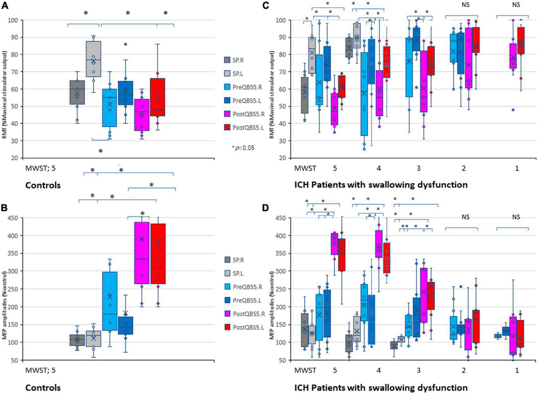Validations of mylohyoid MEP parameters before and after QBS5 conditioning: comparison of characteristic RMT and amplitude profiles and the correlation with MWST scores in healthy controls and ICH patients. Quantitative differences in RMT (A) and amplitude (B) between the six-mylohyoid muscle conditions were statistically significant in healthy controls (P < 0.05). RMTs were significantly lower on the right side (P < 0.05). A multiple comparison test revealed significant differences in RMT and MEP amplitudes, and that the QBS5 induces higher amplitudes with lower stimulus intensities in healthy controls (P < 0.05). Quantitative differences in RMT (C) and amplitude (D) between the six-mylohyoid muscle conditions were compared in patients with ICH. Significant differences in RMT and amplitude (MWST scores 5 to 3) were observed in patients with ICH (C,D; P < 0.001). MWST scores were significantly correlated with RMTs and postQBS5-Rt./Lt.-MEP amplitudes (P < 0.001, respectively) but not those of preQBS5-Rt./Lt. or single-pulse-Rt./Lt. Colors in the graph represent each condition before and after TMS [red: postQBS5-Lt., pink: postQBS5-Rt.; dark blue: preQBS5-Lt.; light blue: preQBS5-Rt.; dark gray: single-pulse Rt.; right gray: single-pulse-Lt. in healthy controls (A,B) and MWST-parameter correlations in patients with ICH (C,D), respectively]. QBS5, five-ms-quadri-burst stimulation; QPS, quadripulse stimulation; SP, single pulse; ICH, intracerebral hemorrhage; RMT, resting motor threshold; MEP, motor evoked potential; MWST, modified water swallowing test.