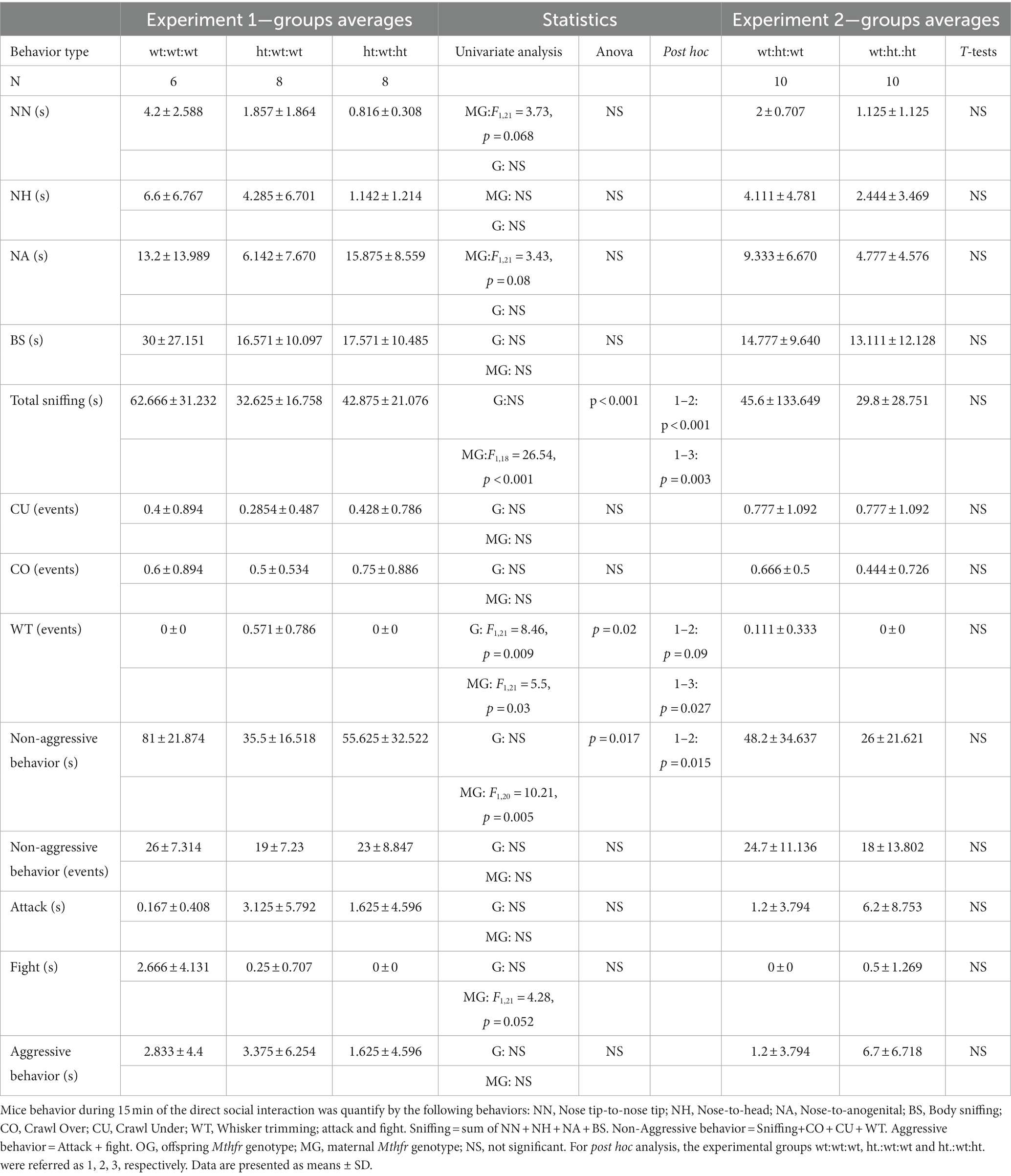 Sociability: The total duration of sniffing was suppressed by the maternal Mthfr+/− genotype from 62.6 ± 31.2 s in the wt:wt:wt group to 32.6 ± 16.7 s and 42.8 ± 21.1 s in the offspring of Mthfr+/− dams (ht:wt:wt and ht.:wt:ht., respectively, F1,18 = 26.5, p < 0.001) as shown in Figures 2A,B and Table 1. The duration of all non-aggressive behaviors in the wt:wt:wt groups, 81 ± 21.8 s, was longer than those of Mthfr+/− dam offspring in the ht.:wt:wt and ht.:wt:ht. groups, 35.3 ± 16.5 s and 55.6 ± 32.5 s, respectively (F1,20 = 10.2, p = 0.005). The similar number of non-aggressive events observed in the latter two groups led us to conclude that the duration of each non-aggressive event was shorter in the affected mice. Whisker trimming, representing a dominant behavior in the mice was differentially affected by the maternal and offspring genotypes, such that it was elevated by the maternal and suppressed by the offspring Mthfr+/− genotype (F1,21 = 5.5, p = 0.03, F1,21 = 8.46, p = 009, respectively Figures 2C,D).