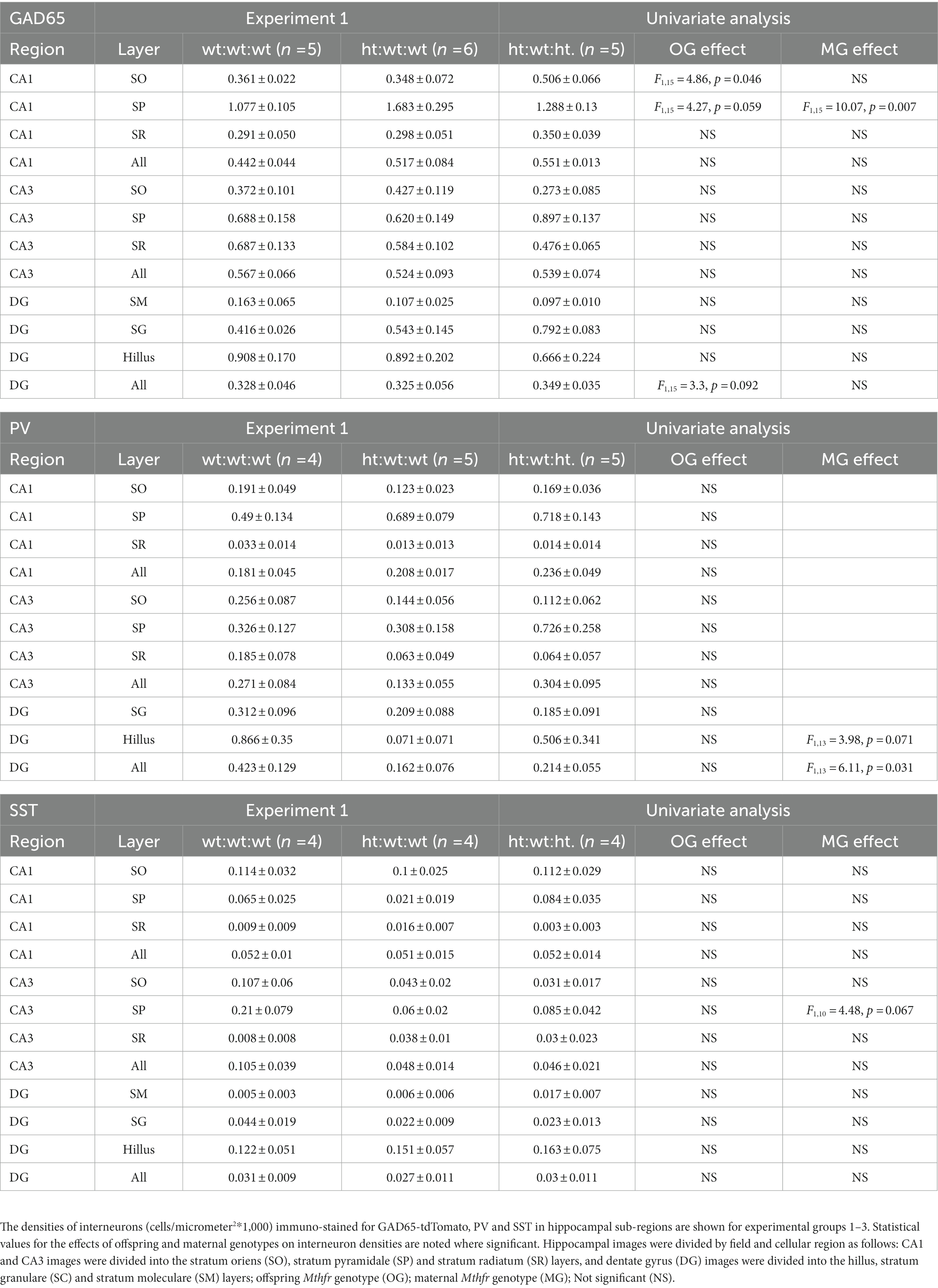 Total SST interneuron density under the maternal Mthfr+/− genotype tended overall to decrease by maternal Mthfr+/− genotype (F1,12 = 3.84, p = 0.079), but contrasting layer specific effects were observed: the offspring Mthfr+/− genotype increased SST densities in layers 1 and 3 (F1,12 = 5.76, p = 0.037 and F1,12 = 7.09, p = 0.024, respectively), and the maternal Mthfr+/− genotype decreased them in cortical layer 3 compared to the offspring of Mthfr+/+ dams (F1,12 = 7.79, p = 0.019, Figures 4E,F). Consistent with this finding, SST interneuron density in the FC was reduced by the maternal Mthfr+/− genotype relative to the Mthfr+/+ genotype in layer 3 (F1,12 = 7.45, p = 0.021, Supplementary Figures S4E,F). The analysis of SST interneuron densities in the hippocampus is presented in Table 2.