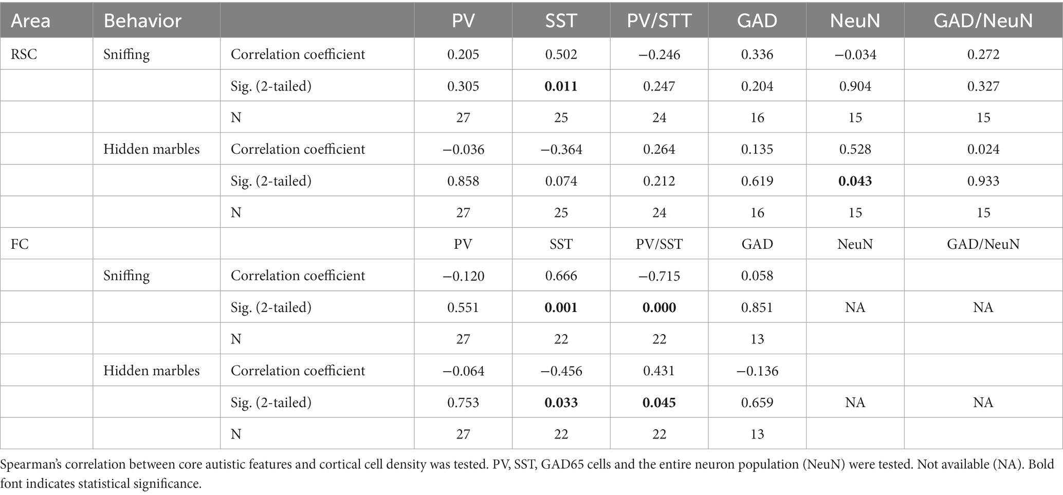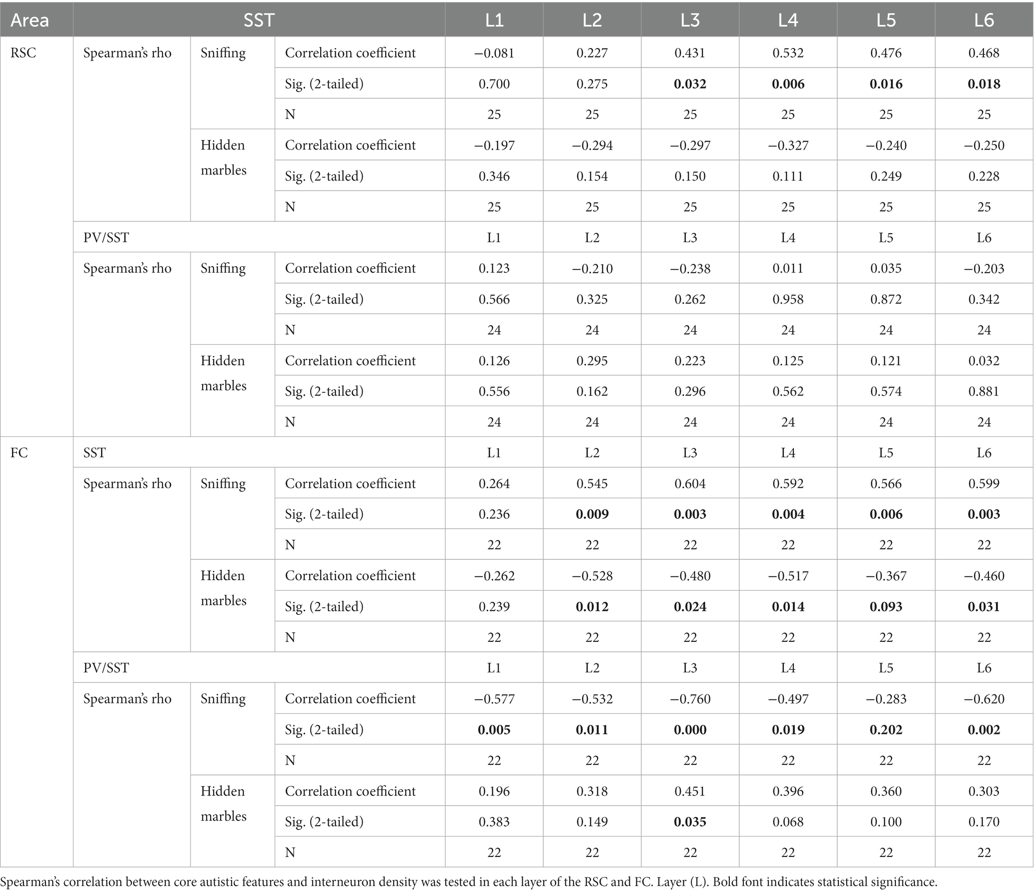 To assess whether interneuron densities in a particular layer of the RSC and FC regions contributed to the observed behaviors, the correlation was calculated by cortical layer (Table 4). SST densities in layers 3 and below and layers 2 and below in the RSC and FC regions, respectively, positively correlated with sniffing behavior. Moreover, the negative correlation of PV/SST ratio with sniffing was observed in most cortical layers, while the positive correlation with repetitive behavior was limited mainly to the contribution of FC layer 3 (Table 4 and Figures 5K,L).