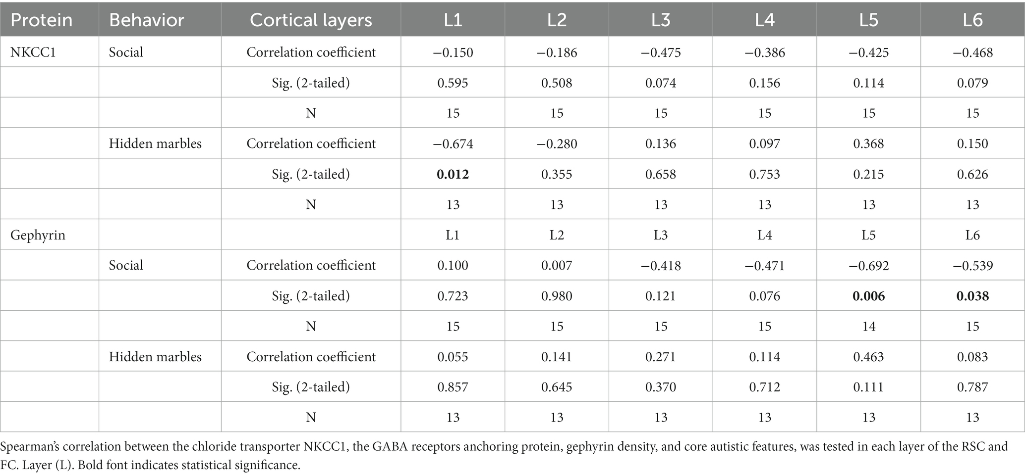 The inhibitory tone in general depends on interneuron density, distribution and synaptic connectivity. Evaluation of the immunoreactivity of gephyrin as a marker for GABAergic postsynaptic clusters found similar levels of the protein in the RSC of all groups (Figures 6A,B). We then examined the levels of a sodium-potassium-chloride transporter, NKCC1, which helps control the intracellular chloride equilibrium. The contribution of NKCC1 to normal neurological function is exemplified by the positive effect of its antagonist, bumetanide, in neurological conditions (Löscher and Kaila, 2022). Layer specific analysis revealed that the maternal Mthfr+/− genotype was associated with enhanced NKCC1 levels in layer 2 of the RSC (Figures 6C,D), while NKCC1 levels in layer 1 negatively correlated with repetitive behavior (R = −0.67, Table 5). Evaluation by behavioral phenotype exposed a negative correlation between gephyrin levels in RSC layers 5 and 6 and social behavior (R = −0.69 and R = −0.54, respectively, Table 5), associating inhibitory synapses that populate the deep cortical layers with social phenotype.