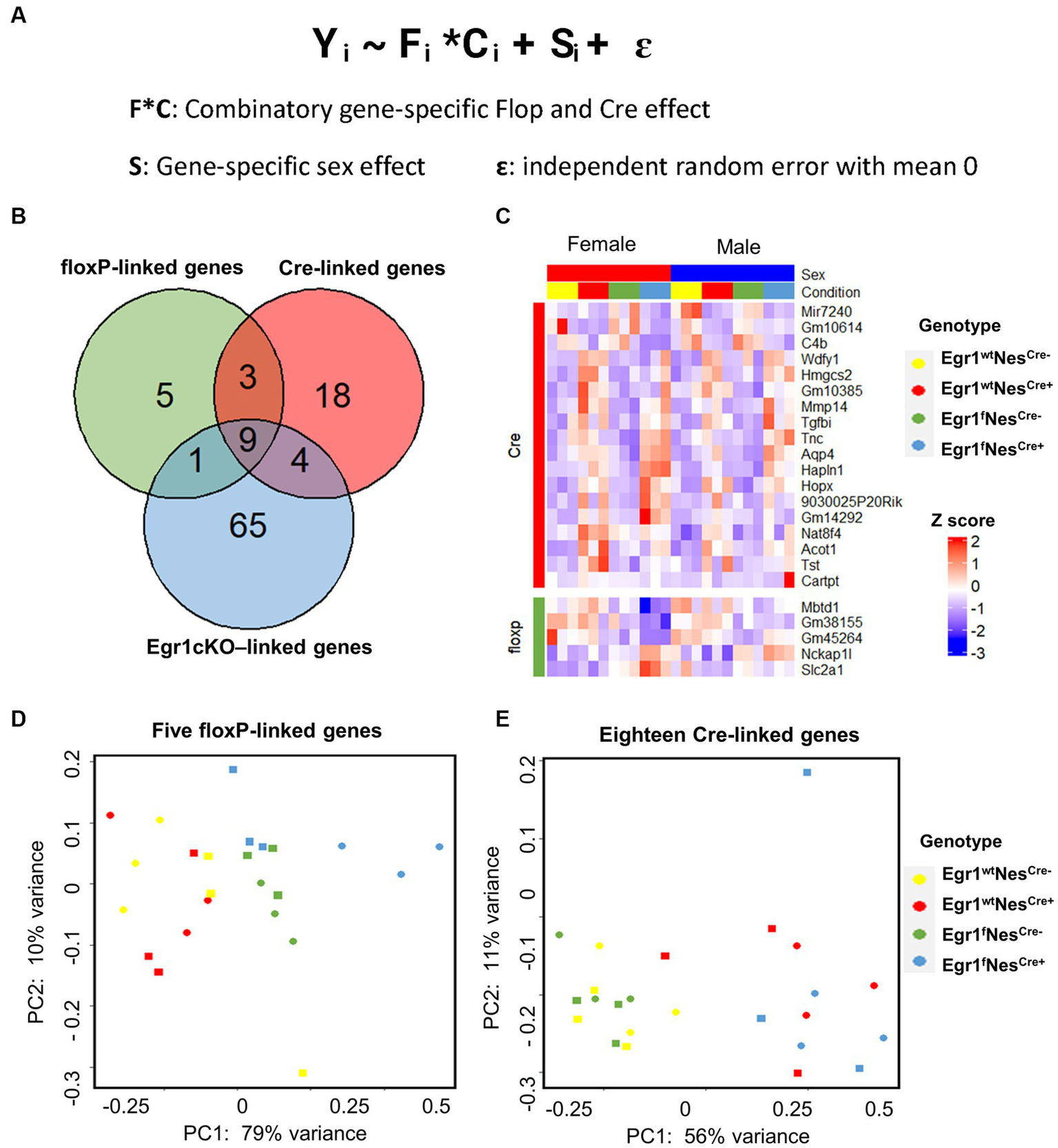 Differential gene expression analysis using a mixed-effects model. (A) Formula of mixed-effects model. (B) Venn diagram showing the overlapped DEGs identified. (C) Heatmap of gene expression profiles for DEGs identified to be linked with floxP or Nestin-Cre. (D,E) PCA analyses for five floxP-linked (D) and 18 Nestin-Cre-linked genes (E).
