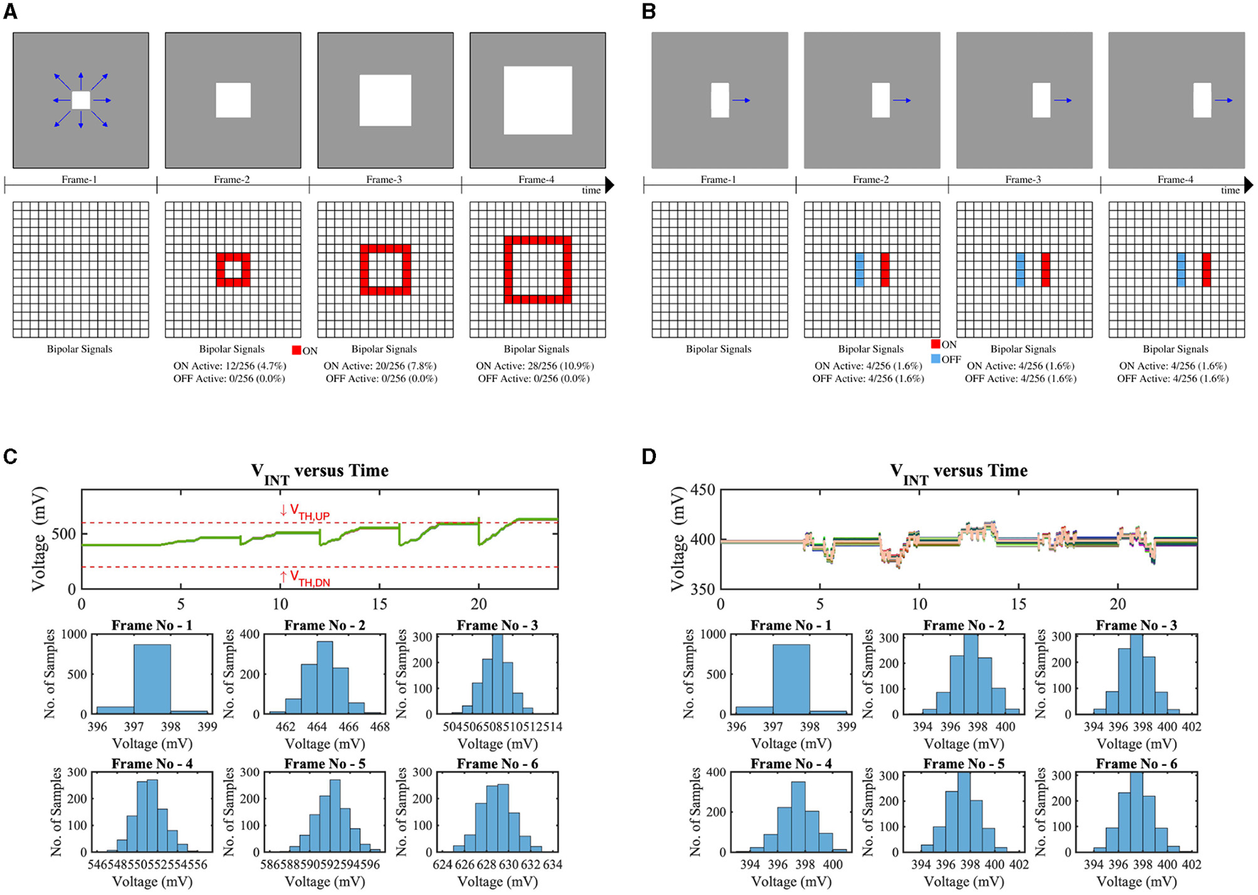Test scenes and corresponding bipolar signals of consecutive frames where a bright square object is (A) approaching, (B) horizontally moving in the dark background, VINT (the voltage on the intrinsic capacitor Cint in Figure 9A) distribution for (C) test-(a), and (D) test-(b).