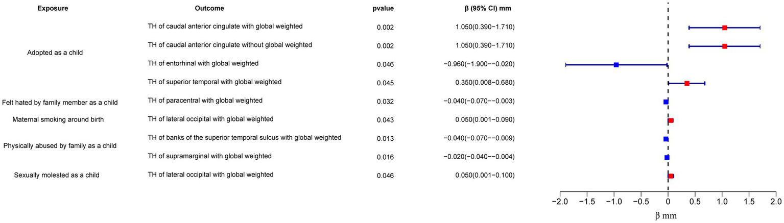 In the regional-level MR analysis, we observed associations between the factor “Adopted as a child” and the TH of the caudal anterior cingulate with global weighted (β = 1.05 mm, 95% CI: 0.39 mm to 1.71 mm, p = 0.002, unless otherwise specified, default displaying IVW results), the TH of the caudal anterior cingulate without global weighted (β = 1.05 mm, 95% CI: 0.39 mm to 1.71 mm, p = 0.002), the TH of the superior temporal with global weighted (β = 0.35 mm, 95% CI: 0.008 mm to 0.68 mm, p = 0.045), and the TH of the entorhinal with global weighted (β = −0.96 mm, 95% CI: −1.9 mm to −0.02 mm, p = 0.046) (Figures 2–4; Table 1, Supplementary Figure S1). It is worth noting that the results of TH of the caudal anterior cingulate with global weighted and the TH of the caudal anterior cingulate without global weighted analyses are identical, suggesting that the inclusion of global weighted did not affect the SNPs used in our study. The associations between “Adopted as a child” and the TH of the caudal anterior cingulate with global weighted (β = 0.91 mm, 95% CI: 0.05 mm to 1.78 mm, p = 0.037), the TH of the caudal anterior cingulate without global weighted (β = 0.91 mm, 95% CI: 0.05 mm to 1.78 mm, p = 0.037), and the TH of the entorhinal with global weighted (β = −1.32 mm, 95% CI: −2.62 mm to −0.02 mm, p = 0.047) were also supported by the weighted median method (Supplementary Table S10). Furthermore, the directions of effect (β values) were consistent across all three MR methods. For all the nominally significant results, Cochran’s Q-test did not detect any heterogeneity (Supplementary Table S12). Moreover, the p-values of the MR-Egger intercept exceeded 0.05, which implies the absence of intercept values (Supplementary Table S11). Additionally, no outliers were found in this study according to the leave-one-out sensitivity test and funnel plots (Supplementary Figure S2-S4).