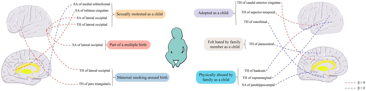 The cerebral cortex serves as the foundation for human complex cognitive abilities. Variations in cortical surface area (SA) and thickness (TH) are associated with neural, psychological, and behavioral characteristics (Grasby et al., 2020). Numerous research studies have reported an association between childhood maltreatment and changes in brain structure and function. In both laboratory and population-based studies, specific regions such as the adult hippocampus or the anterior cingulate cortex, as well as pathways like the corpus callosum, have been consistently implicated in relation to childhood maltreatment (Teicher et al., 2016). Mechanistically, some researchers propose that experiences occurring during prenatal development and the early years of life, when the developing brain is highly susceptible to environmental influences, may lead to permanent changes in brain structure and function through epigenetic modifications (e.g., alterations in DNA structure and chromatin function) (Miguel et al., 2019). However, the causal relationship between early adversity and the cerebral cortex is still not fully understood.