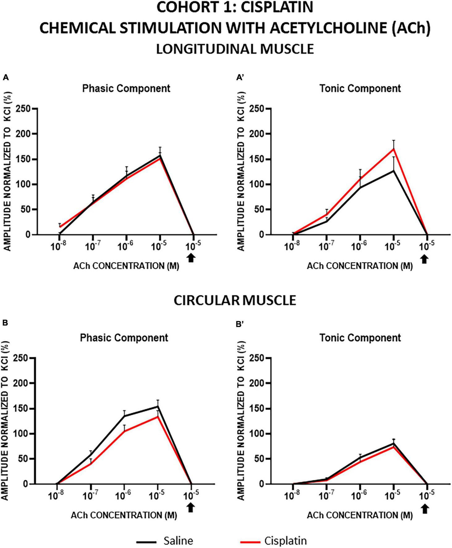 Longitudinal and circular muscle response to chemical stimulation with acetylcholine in cohort 1: cisplatin. The preparations were exposed to increasing concentrations of acetylcholine (ACh: 10–8–10–5 M). Atropine was administered at 10–6 M and thereafter, the effect of ACh at 10–5 M was recorded (arrow). Graphs represent the phasic (A) and tonic (A’) component of the contractile response in longitudinal muscle and the phasic (B) and tonic (B’) component of the contractile response in circular muscle. Rats were intraperitoneally administered with saline (2.5 mL kg–1) or cisplatin (2 mg kg–1) for 5 consecutive weeks (weeks 1–5). Treatments were: saline (black line, n = 7) and cisplatin (red line, n = 9). Data represent the mean ± SEM.