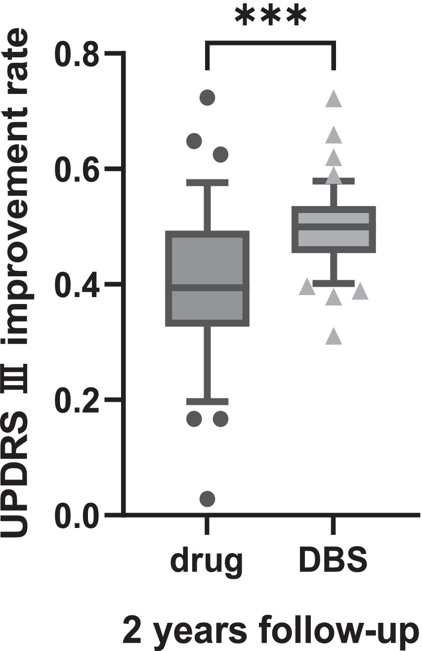 The change in the UPDRS-III and MOCA scores in Tables 2, 3 revealed that motor signs and cognition were progressing in both groups. The degree of change in UPDRS III and MOCA scores was compared between the two groups, and the results suggested that the patients in the DBS-G group had a greater degree of reduction of motor function than the Drug-G in both the first and second year of the follow-up (Figure 1A). However, the MOCA scores of the Drug-G group declined more than those in the DBS-G group in the second year (Figure 1B). Then, the rate of improvement in the UPDRS-III in the “on” state was compared between the two groups after two years of follow-up. The improvement rate refers to the difference between the patient’s UPDRS III score in the “off” and “on” states in the second year, and then dividing by the UPDRS III score in the “of” state in the second year. The results suggested that the degree of improvement in motor function was significantly greater in the DBS-G patients than in the Drug-G (Figure 2).