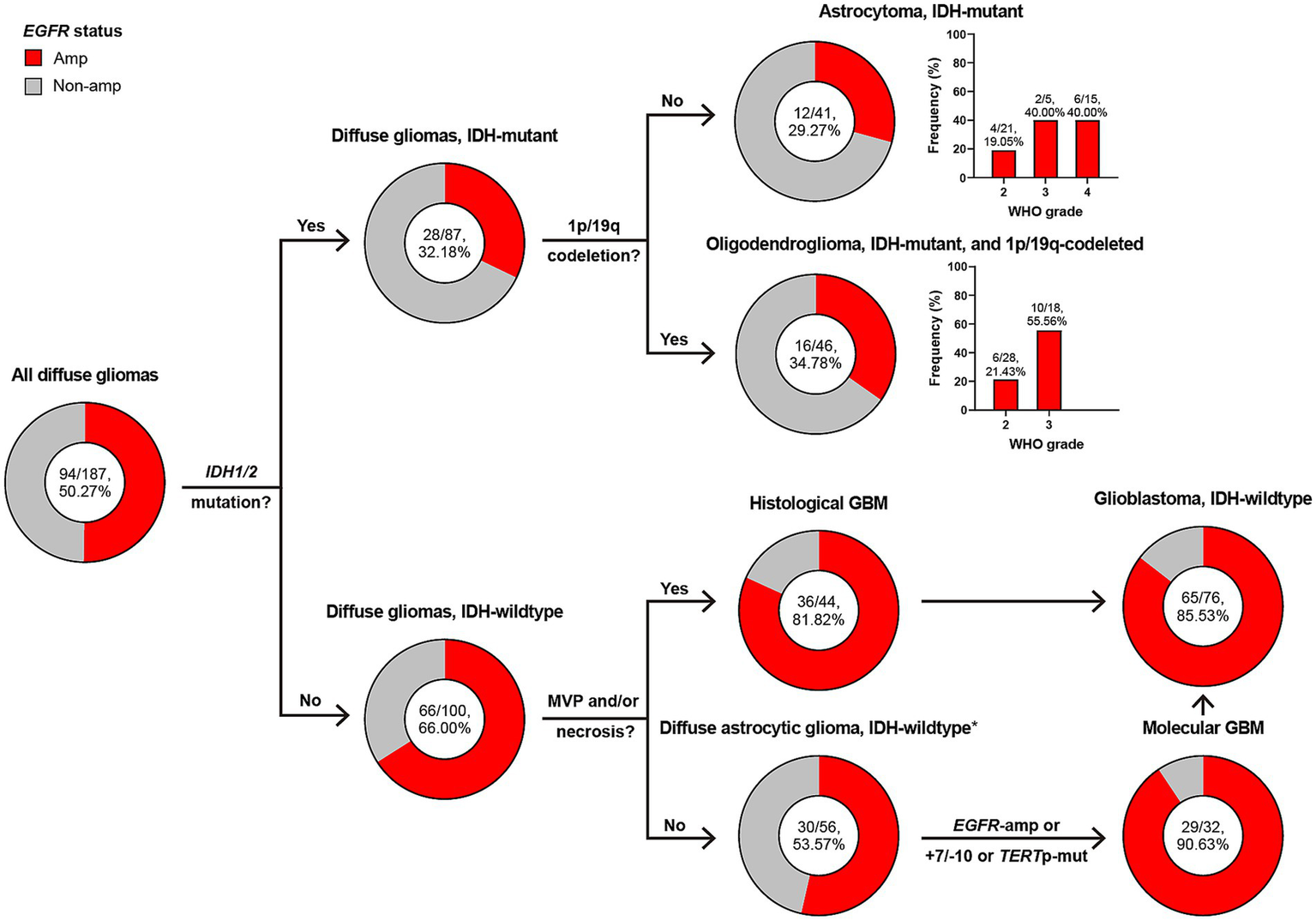 Figure 2. Classification of diffuse gliomas according to histological and molecular markers, and frequency of EGFR amplification in different subgroups. The total patient number, and the number plus percentage of patients with EGFR amplification in each group are presented. *Diffuse astrocytic glioma, IDH-wildtype refers to histologic grade 2 and 3 IDH-wildtype diffuse astrocytic gliomas, as is stated in cIMPACT-NOW update 3 (Brat et al., 2018). Amp, amplification; Non-amp, non-amplification; MVP, microvascular proliferation; GBM, glioblastoma, IDH-wildtype; +7/−10, combined whole chromosome 7 gain and whole chromosome 10 loss; TERTp, TERT promoter; Mut, mutation.