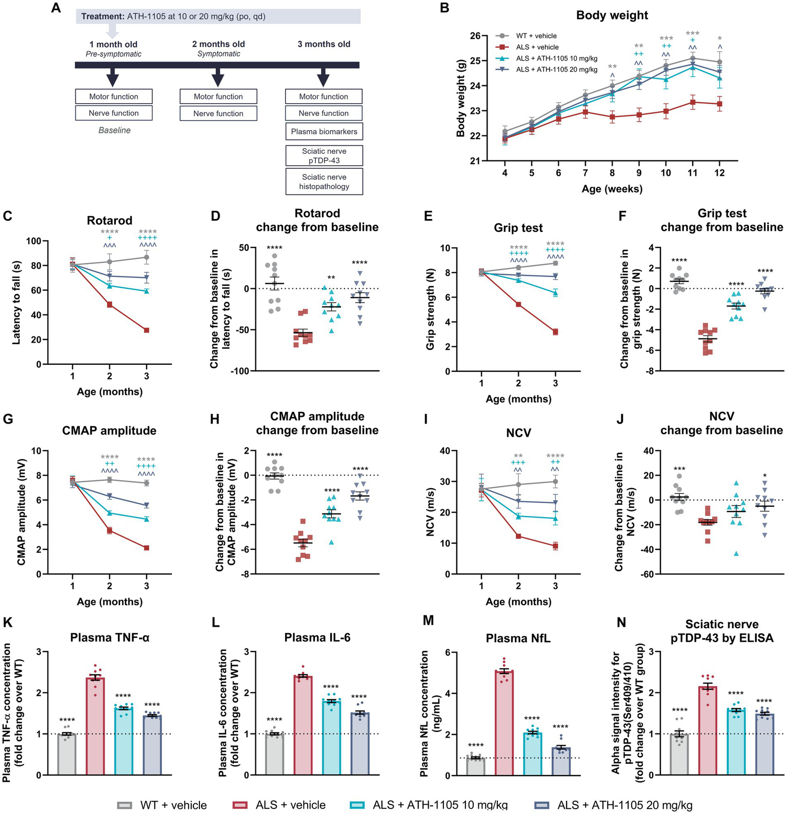 In vitro, ATH-1105 augmented phosphorylation of MET, ERK, and AKT. ATH-1105 attenuated glutamate-mediated excitotoxicity in primary motor neurons and motor neuron- astrocyte cocultures, and had protective effects on motor neurons and neuromuscular junctions in motor neuron-muscle cocultures. ATH-1105 mitigated LPS-induced inflammation in microglia- and macrophage-like cell systems. In vivo, ATH-1105 treatment resulted in improved motor and nerve function, sciatic nerve axon and myelin integrity, and survival in ALS mice. Treatment with ATH-1105 also led to reductions in levels of plasma biomarkers of inflammation and neurodegeneration, along with decreased pathological protein accumulation (phospho-TDP-43) in the sciatic nerve. Additionally, both early intervention (treatment initiation at 1 month of age) and delayed intervention (treatment initiation at 2 months of age) with ATH-1105 produced benefits in this preclinical model of ALS.