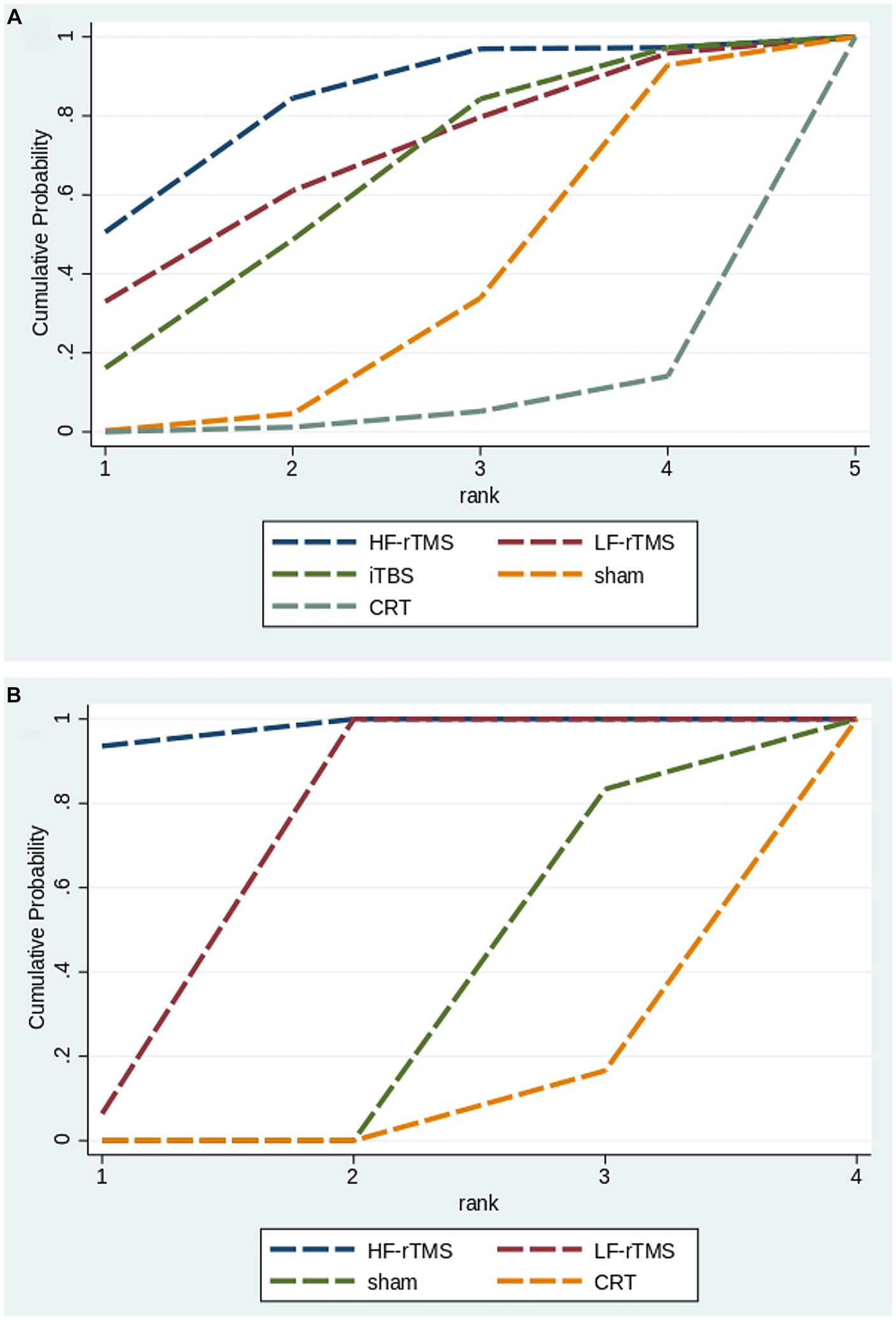 A total of 22 studies and 1,473 patients were included, comprising 5 interventions: high frequency repetitive transcranial magnetic stimulation (HF-rTMS), low frequency repetitive transcranial magnetic stimulation (LF-rTMS), intermittent theta burst stimulation (iTBS), sham stimulation and conventional rehabilitation therapy (CRT). Network Meta-analysis showed that the ranking results of different TMS intervention modalities in terms of MoCA scores were: HF-rTMS > LF-rTMS > iTBS > sham > CRT, the ranking results of different TMS intervention modalities in terms of MMSE scores were: HF-rTMS > LF-rTMS > sham > CRT. The effect of TMS on improving Parkinsonian cognitive function lasted for 1 month compared to the no-stimulation group.