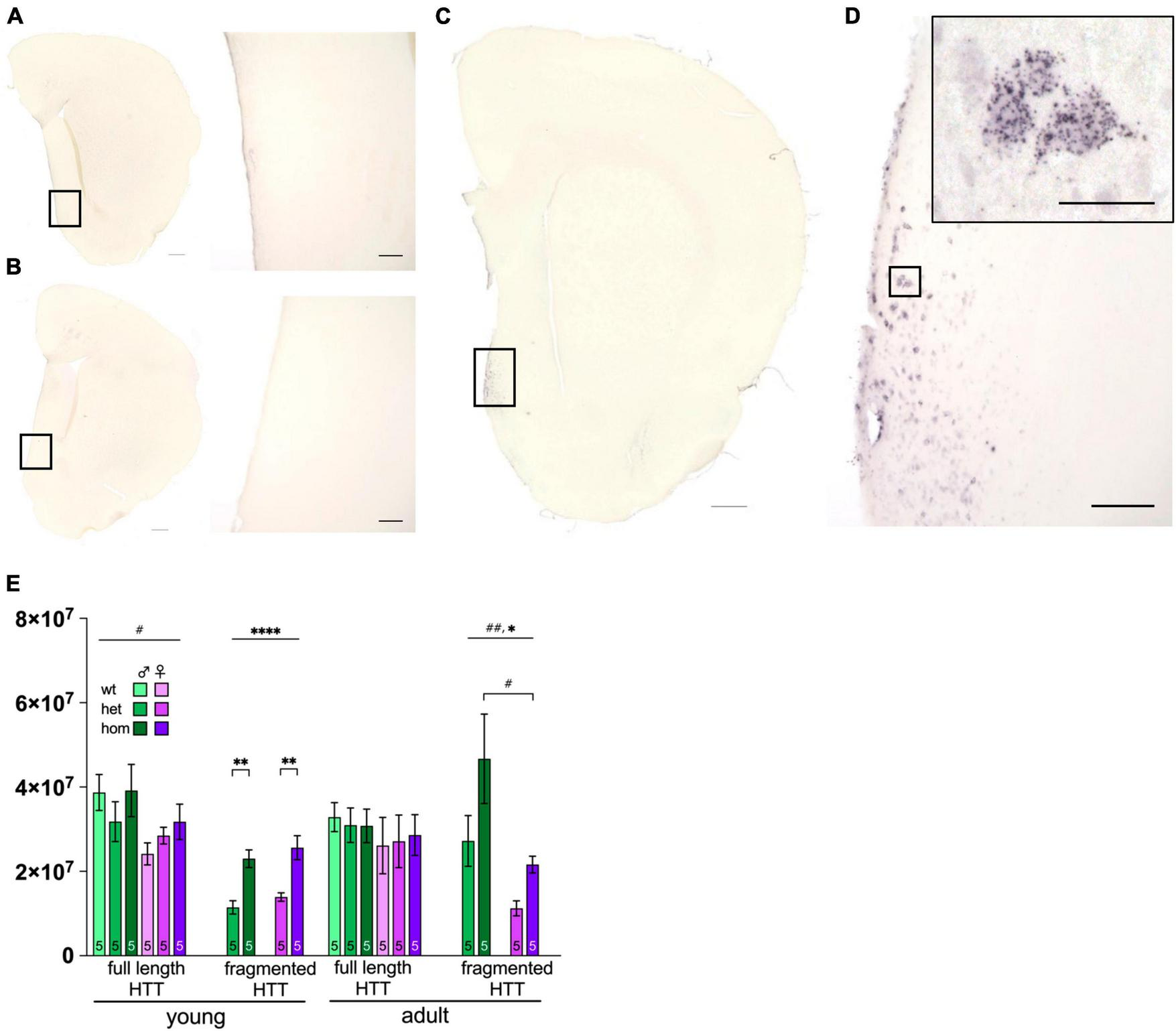 Huntingtin protein distribution and levels in F344tgHD rats. Immunohistological detection of mHTT via anti-polyQ antibody 1c2 in 8 months old F344tgHD male is exemplarily depicted for one hemisphere of wt (A), het (B) and one hom (C) animal including a magnified portion of the highlighted area (D). Scales in (A–C) =̂ 500 μm, scale in (D) =̂ 100 μm and in magnified area =̂ 25 μm. (E) Protein level of full length and transgenic (fragmented) HTT were quantified with anti-HTT antibody Mab2166 in striatum enriched samples at young and adult age in F344tgHD males and females. Data is presented as mean ± SEM. Hashtags indicate significant statistical effects between sexes (#p < 0.05, ##p < 0.02, ###p < 0.001, ####p < 0.0001). Asterisks indicate significant genotype differences (*p < 0.05). Paragraphs indicate significant interaction between factors “sex” and “genotype” (§§ < 0.02). The investigated n is indicated at the bottom of each bar.