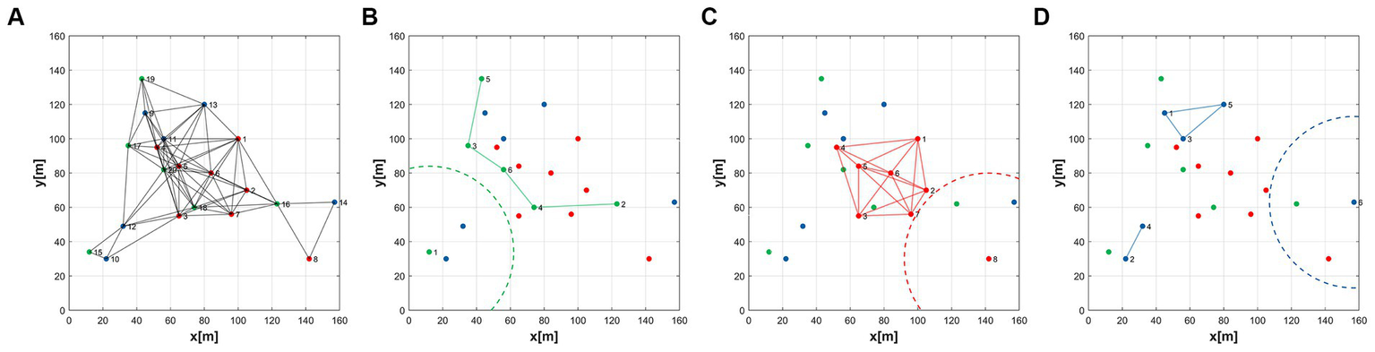 It is worth noting that the control method (Eq. 20) proposed in this study requires a network constraint that is the initial network connection of the MAS. The algorithm in this study allows networks between subgroups to be disconnected. Although the agents may not receive the information of other agents in the same sub-term, each subgroup can reach the split formation based on .