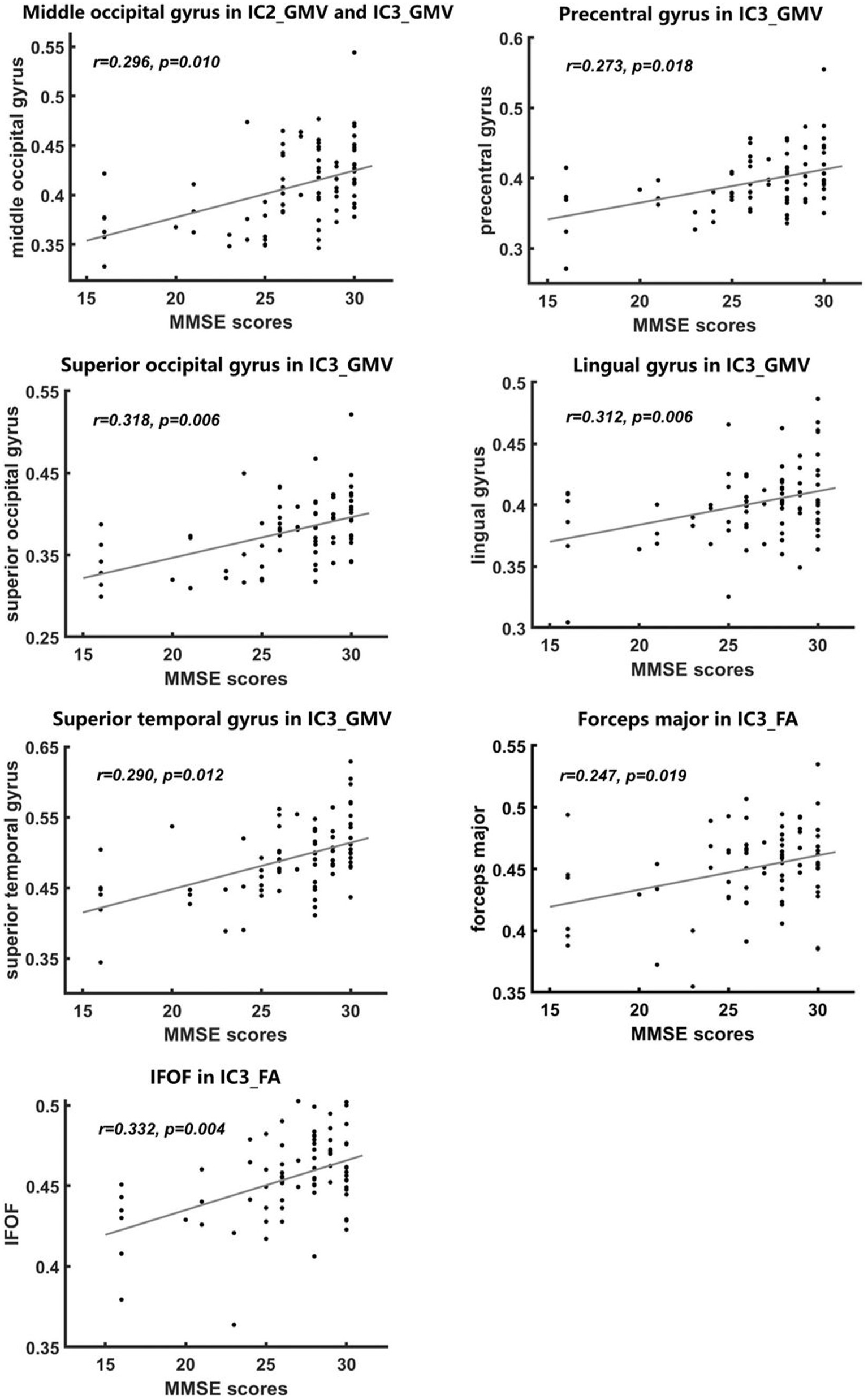 Correlations between imaging metrics and MMSE scores. Significant positive correlations between MMSE scores and FA and GMV values were found in some abnormal brain regions of the IC3 and IC2 findings (A–G), with age and gender controlled as covariates. All p-values were FDR-corrected for multiple comparisons.