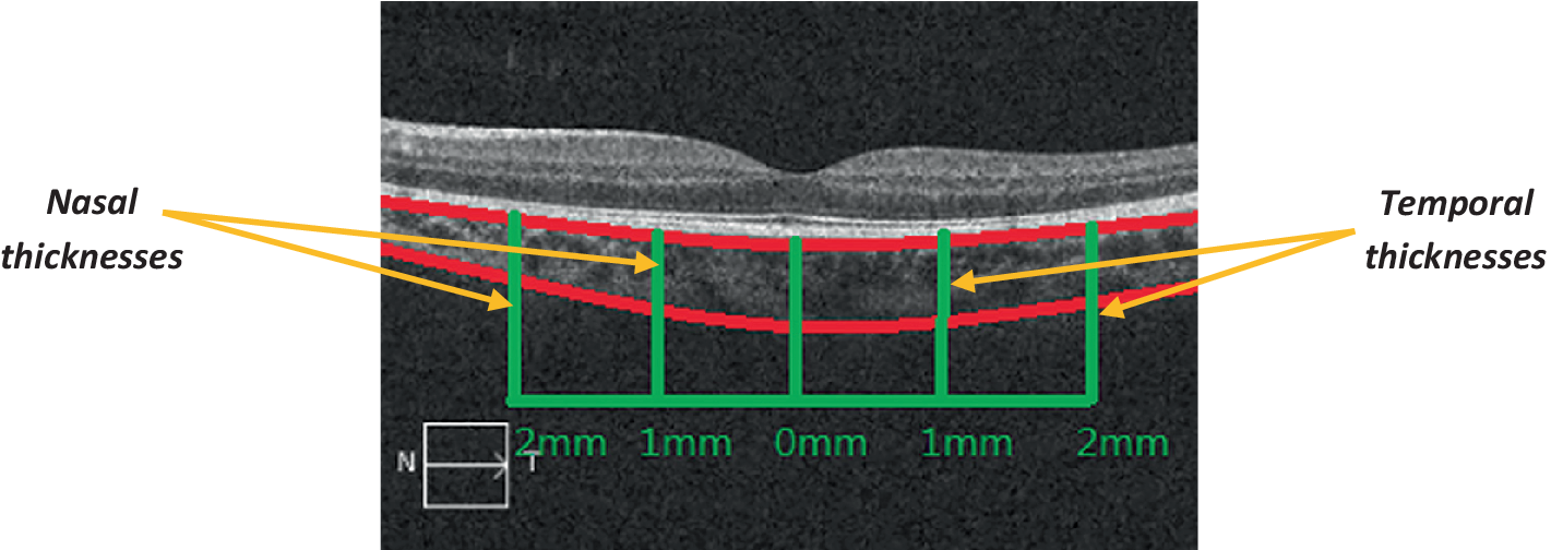 OCT can also be used to measure the width of the choroid (Ascaso et al., 2017). Figure 5 shows an example of choroidal thickness measured via OCT (Li et al., 2016).