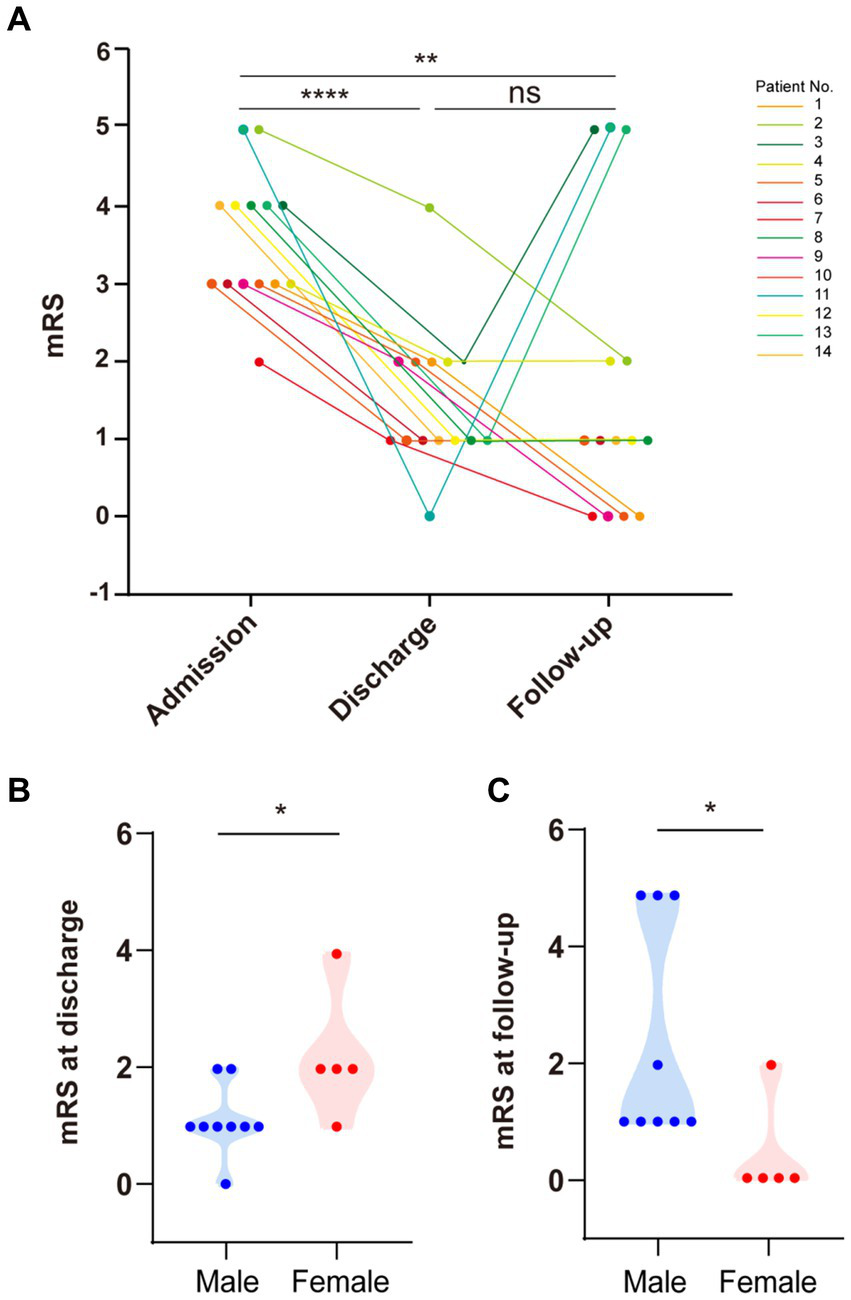Modified Rankin Scale (mRS) scores at admission, discharge, and follow-up. (A) There was a significant difference in mRS scores between patients at admission and discharge (paired t-test, p < 0.0001). There was a significant difference in mRS scores between patients at admission and follow-up (paired t-test, p < 0.01). There was no significant difference in mRS scores between patients at discharge and follow-up. (B) Females had higher mRS scores than males at discharge (p < 0.05). (C) Males had higher mRS scores than females during follow-up (p < 0.05).