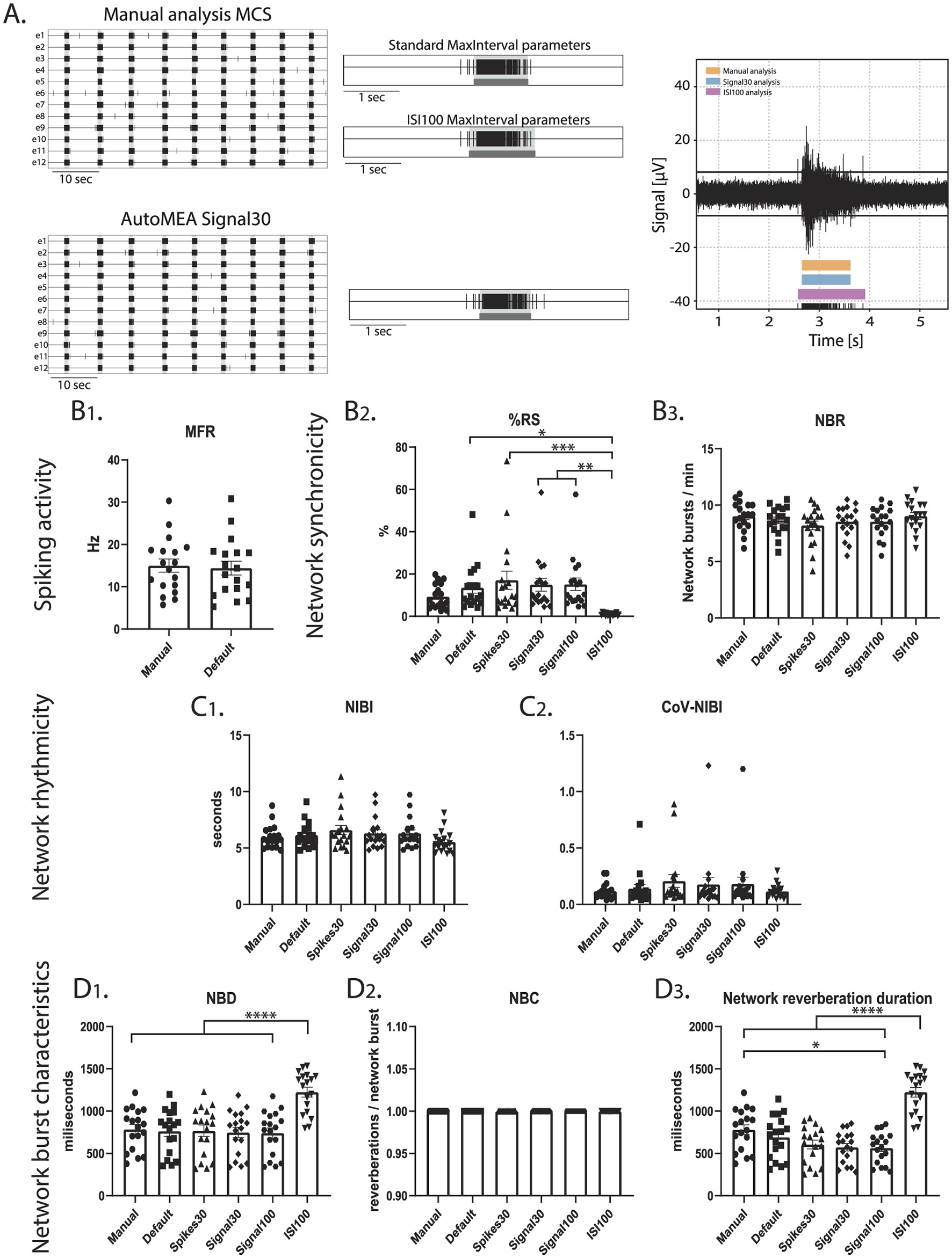 With autoMEA software, we also provide experimenters with an open-source user-friendly software package. While the software that is provided with the commercial hardware outputs timestamp files that need to be post-processed to extract relevant parameters, our model does not require any need for coding expertise or manual data processing to post-process the output into quantifiable outcome parameters that are relevant to describe neuronal network dynamics. Besides outputting timestamp files, it automatically generates an additional output file with the network parameters describing network synchronicity, rhythmicity, and burst characteristics. Furthermore, one can input multiple recording files into the software, letting it analyze multiple recordings at the same time. Additionally, manual analysis requires the experimenter to actively adjust settings during the analysis of each file, while with autoMEA software, the analysis is performed completely autonomously without the experimenter's input. Running the software may take from minutes up to a few hours, depending on the size of the dataset. Therefore, autoMEA software enhances the throughput of MEA-data analysis. For a demonstration of the user-friendliness of autoMEA, see Supplementary material.