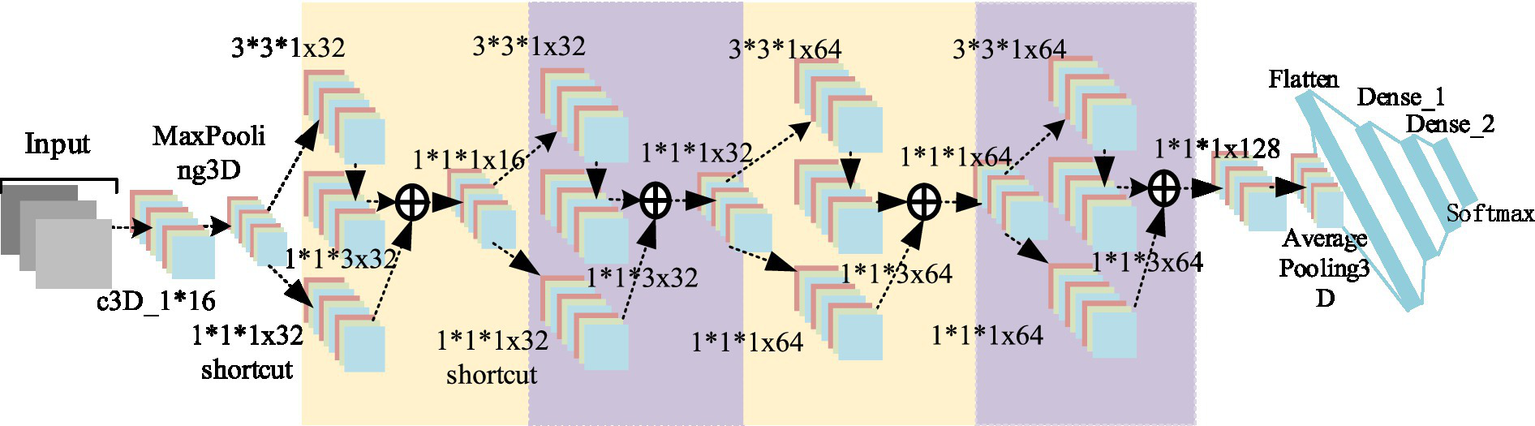 In the proposed D3DCNN_ResNet, the residual module is added to learn the residual mapping to further solve the problems of gradient descent and over fitting with the deepening of the network depth, and more subtle multi-level features are obtained through the interconnection between different convolution layers and different residual blocks in the residual block.