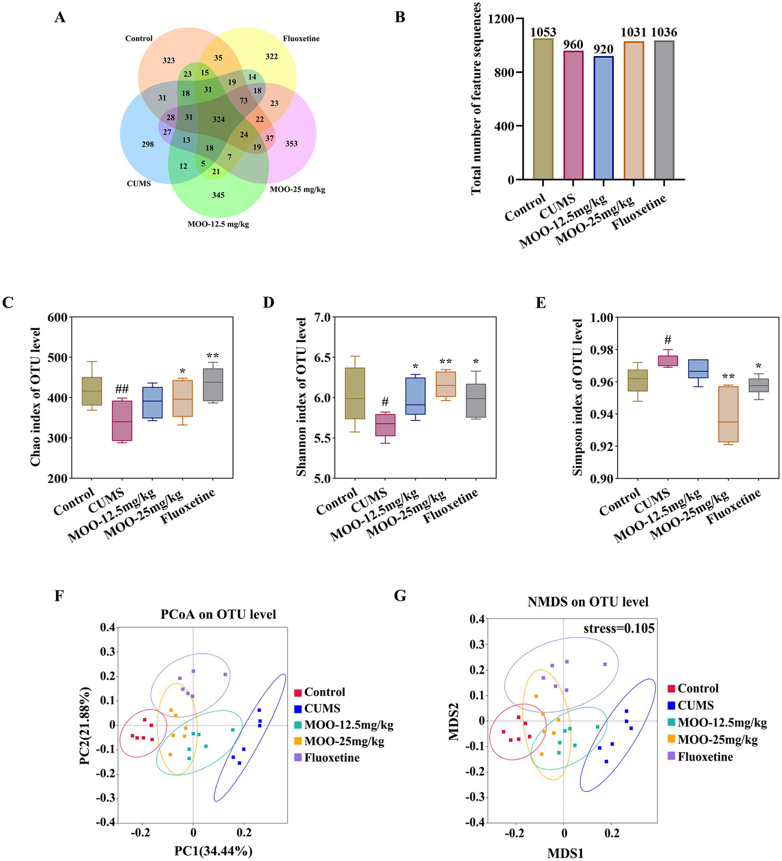 Figure 5. Effect of MOO on the diversity of gut microbiota in CUMS-induced mice. (A,B) Wayne’s diagram of OTU core discs and their quantitative values. (C–E) Effect of MOO on α-diversity of gut microbiota in mice, Chao’s index (C), Shannon’s index (D), and Simpson’s index (E). (F,G) Effect of MOO on β-diversity of gut microbiota in mice. Results are expressed as mean ± SD (n = 6). #p < 0.05, ##p < 0.01, vs. control group; *p < 0.05, **p < 0.01 vs. CUMS group.