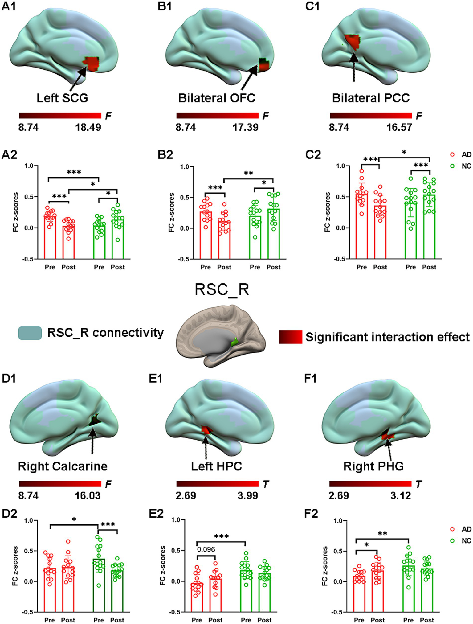 The effect of acupuncture on right RSC connectivity in the AD and NC groups as revealed by atlas-based ROI analysis. Two-way repeated-measures ANOVA revealed significant interaction effects (in warm colors) by acupuncture treatment on functional connectivity between right RSC and left SCG (A1), and bilateral OFC (B1), and bilateral PCC (C1), and right calcarine (D1), and left HPC (E1), and right PHG (F1). Significantly results were overlaid on the spatial maps (shown in green) of right RSC (cluster-level FWE correction). (A2) Average functional connectivity between right RSC and left SCG that showed significant interaction between group and acupuncture in the AD and NC groups. (B2) Average functional connectivity between right RSC and bilateral OFC that showed significant interaction between group and acupuncture in the AD and NC groups. (C2) Average functional connectivity between right RSC and bilateral PCC that showed significant interaction between group and acupuncture in the AD and NC groups. (D2) Average functional connectivity between right RSC and right calcarine that showed significant interaction between group and acupuncture in the AD and NC groups. (E2) Average functional connectivity between right RSC and left HPC that showed significant interaction between group and acupuncture in the AD and NC groups. (F2) Average functional connectivity between right RSC and right PHG that showed significant interaction between group and acupuncture in the AD and NC groups. Bar plots displayed mean rsFC z scores for the AD and NC groups. ***p < 0.001, **p < 0.01, and *p < 0.05. RSC, retrosplenial cortex; PCC, posterior cingulate cortex; OFC, orbitofrontal cortex; SCG, subcallosal cingulate gyrus; HPC, hippocampus; PHG, parahippocampal gyrus; AD, Alzheimer’s disease; NC, normal controls.