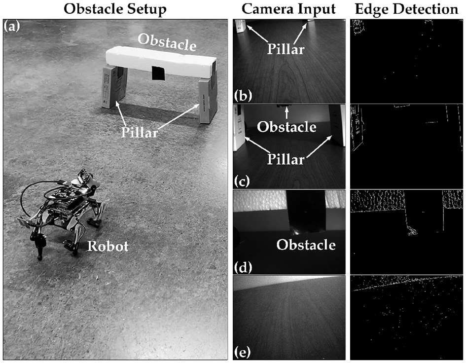 Our control scheme is organized in hierarchical steps, as illustrated in the flowgraph in Figure 1. At the top layer, DSM oversees the entire network behavior, with user commands given the highest priority. The two-layer network consists of the CPG and a fully interconnected MTF neuron network without self-connections as layer one, and an integrate-and-fire (IF) neuron network as layer two. The layer two neurons are fully connected to the previous layers, as shown in the network architecture in Figure 9. The importance of the bi-layer structure will be explained later in this section in detail. This network is responsible for generating precise timing and patterns needed to send motor commands based on the gait. To demonstrate the benefits of our idea, we examine a simple obstacle avoidance scenario with two phases, using a camera event as the main controlling flag. Once the prerequisite states (walk and crawl) are learned, the system autonomously avoids horizontal obstacles in its path by transitioning from walking to crawling. It is worth noting that this approach can be extended to avoid any type of obstacle by adapting to a new state. However, as proof of concept, we focus solely on horizontal obstacles. This can be easily achieved by learning a new state for each type of avoidance.
