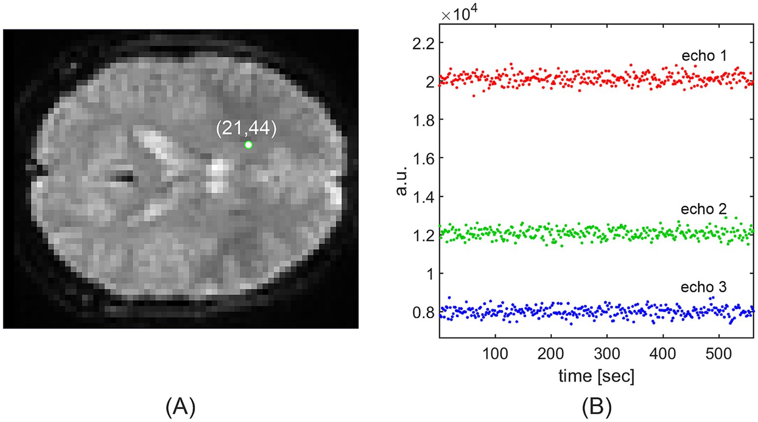 Figure 1. Time courses of three BOLD signal echoes (B) at the green-marked voxel (A) of a resting-state multi-echo fMRI series comprising 312 frames (data from sub-01). The BOLD signal was sampled with the repetition time of TR = 1,800 ms. As invasive measurements in animals show that the true BOLD signal is smooth, the sampled fMRI signal should also be smooth; however, it fluctuates strongly and needs to be denoised. Without denoising, an estimate of the exponential time constant from the three noisy echoes would result in a strongly oscillating, rather than smooth, T2* time course.