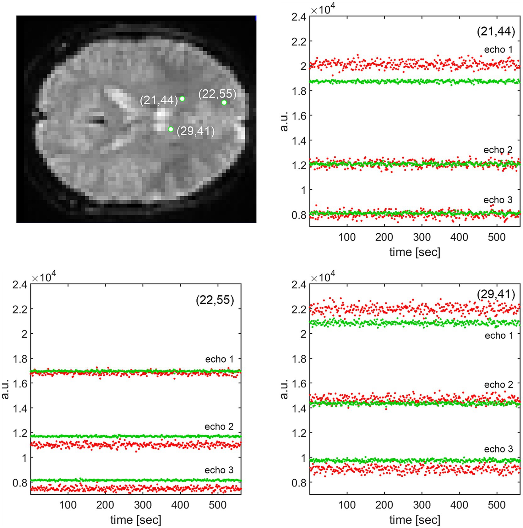 Figure 2. In red: raw (not denoised) time courses of three echoes at three randomly selected green-marked voxels from 312 realigned and MNI-coregistered fMRI frames (data from sub-01). In green: signal time courses at the same voxels after spatial Gaussian smoothing (FWHM = 5 voxels). At the voxel (21,44), e.g., Gaussian smoothing has squeezed the signal mean of the first echo by ~21.3% with respect to the raw signal, while the means of the second and third echoes remained unchanged. The means may contrarily increase in other voxels, such as (22,55) for echoes 2 and 3. As calculated in the text, the vertical drop of the Gaussian-smoothed first echo (21,44) has caused a massive distortion in the T2* estimate, which increased by almost 88%.