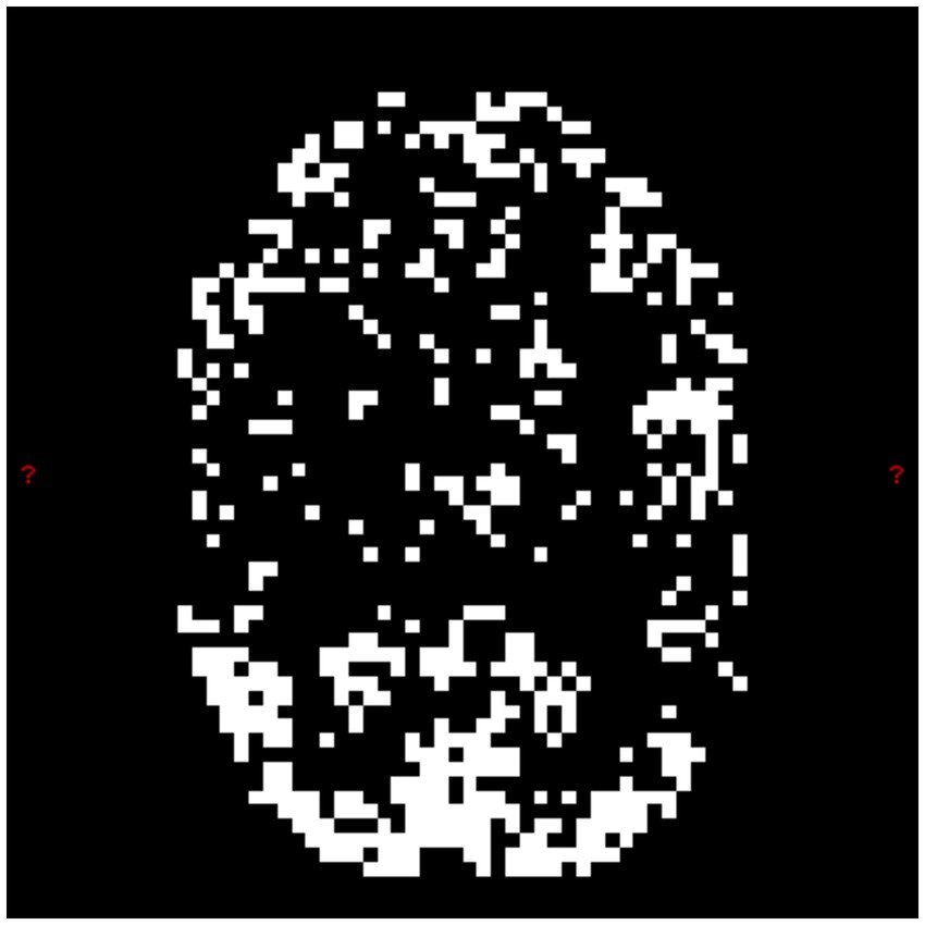 Figure 3. FDR-generated region of interest, middle slice. The highest density of the automatically computed ROI coincides with the visual cortex, as appropriate for the assessment of visual task fMRI data. The input to the above algorithm was the unprocessed echo 2 acquired from our sub-01 during the task described in 2.1.1. To get a fair comparison, the same ROI mask was used for CNR evaluation of T2*-TV fitting, optimal combination, tedana, and T2*-raw fitting.