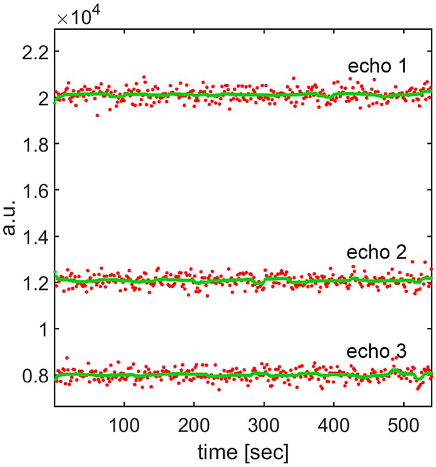 Vertical shifts in the second and third echo time series may be caused by the fact that within the 5 × 5 × 5 voxel surroundings captured by the Gaussian, there are tissues with different relaxation rates R2*. Tissues with faster relaxation (higher R2*) fade out sooner than those with lower R2*. Depending on the Gaussian weighting of fast-relaxation and slow-relaxation voxels within the 5 × 5 × 5 voxel volume, this may result in a vertical shift of the time series mean of echoes 2 and 3 or may leave the mean unchanged. As the shift in the first echo time series depends on the initial signal intensity, while the second and third time series shift depend on the voxel relaxation rate R2* (or time T2*), the time series shifts of echoes 1, 2, and 3 will, in general, differ. Empirically, this is confirmed by the three echo triples in Figure 2.