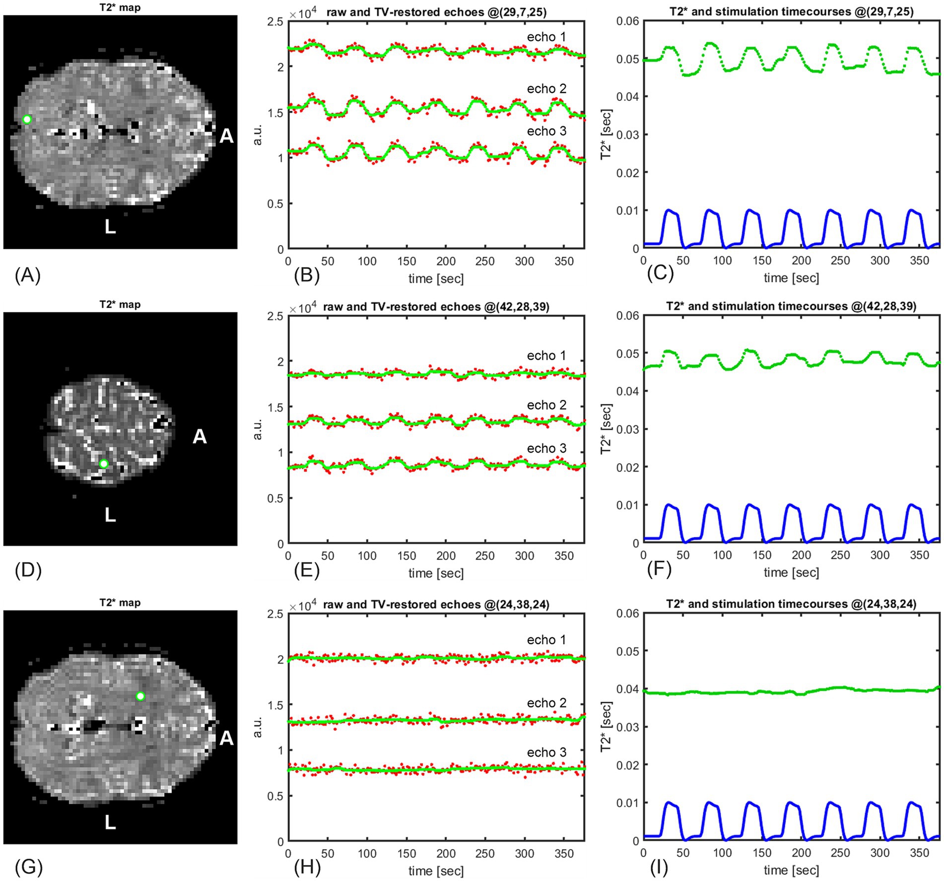 Figure 5. Voxelwise echo restoration and T2* estimation in fMRI multi-echo series. (A,D,G) resulting T2* map with a selection of sample voxels. (B,E,H) restored echoes (green) are—contrary to unrestored echoes (red)—smooth, as are experimental in vivo BOLD signal measurements. (C,F,I) owing to the smooth echoes, the estimated T2* time courses (red) are also smooth. (A,B,C) the highest T2* amplitudes were observed in the visual cortex, voxel (29, 7, 25). (D,E,F) the T2* time course is synchronous with the theoretical hemodynamic response (blue) in a voxel from the motor cortex (42,28,39) of the brain. (G,H,I) voxel (24,38,24) belongs to the transition between gray and white matter; hence, the particular part of the brain should not be activated by the task. This is confirmed by (I), where—unlike in (C,F)—no similarity between the theoretical hemodynamic response and the T2* time course is noticeable.