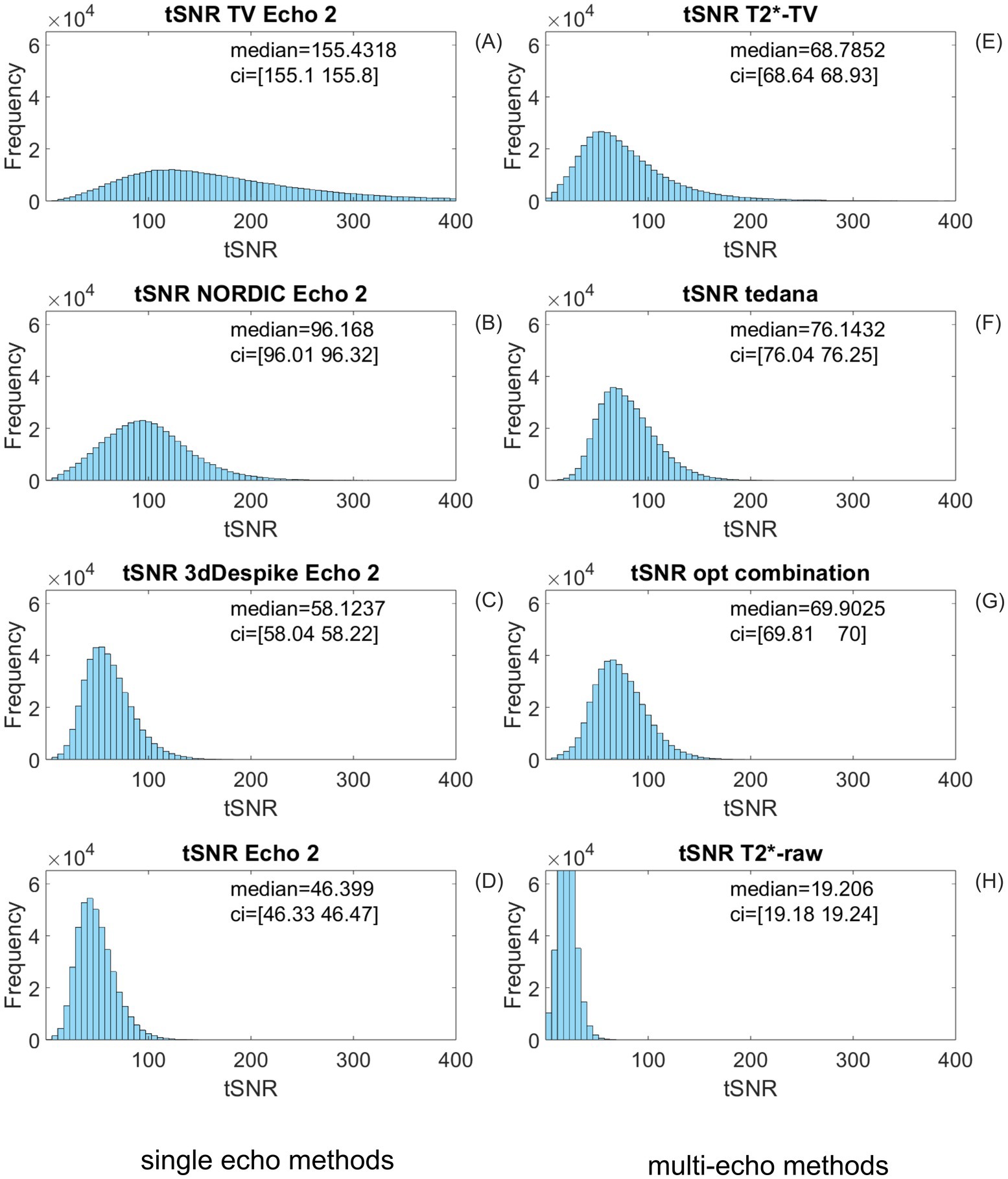 Figure 6. Comparison of tSNR distributions for eight different signal preprocessing variants of all resting-state BOLD signal time courses over the nine study participants. Depending on whether researchers consider single-echo or multi-echo fMRI data, the left or the right column may be more relevant. tSNR medians and their respective confidence intervals are included with each plot. Left column: (A) TV-l2 denoising of echo 2 produces the highest tSNR of the four single-echo BOLD signal processing methods. (B) The single-echo NORDIC-denoised time course features better tSNR distribution than (C) the 3D-despiked echo. The 3D-despiked echo 2, in turn, has a somewhat better signal-to-noise ratio than (D) the raw echo 2, which is often used for fMRI data analysis. Right column: multi-echo preprocessing of fMRI data does not necessarily lead to higher tSNR values. The tedana package (F) has the highest tSNR of the multi-echo methods, yet it is outperformed by the single-echo methods (A,B). tSNR of the T2* mapping from total-variation-denoised three echoes (E), is, for resting-state data, about on a par with the weighted sum of three echoes, referred to as “optimal combination,” (G). An important difference, however, is that T2* mapping delivers quantitative output measured in time units (seconds), while the output of tedana or optimal combination is in arbitrary units. The “optimal combination,” essentially a weighted sum of three echoes, acts as a low-pass filter, and its tSNR is better than that of the plain unprocessed echo 2 (H).