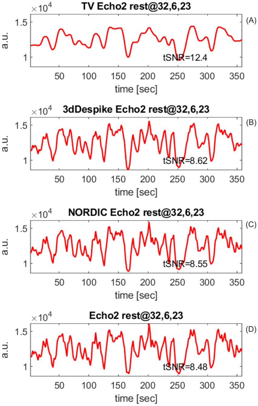 Figure 7. Participant sub-01, voxel (32,6,23). (A) The total-variation-denoised resting-state echo 2 has the highest tSNR and is—contrary to the other time series—smooth. (B) Second-best tSNR was generated by AFNI’s 3dDespike function. (C) NORDIC-denoised echo 2. (D) tSNR of unprocessed echo2. For the participant sub-01, tSNRs of (B,C,D) were not much different.