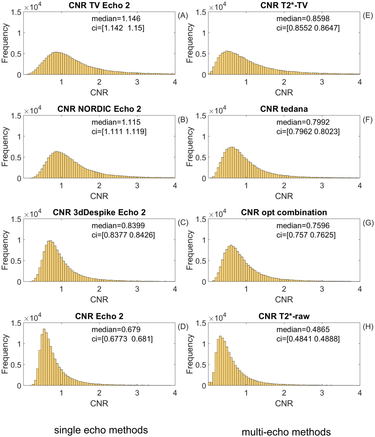 Figure 8. Comparison of CNR distributions over all task runs of nine study participants for four types of single-echo task-based BOLD signal processing and four types of multi-echo task-based BOLD signal processing. (A) The TV-l2 denoising of echo 2 produces the highest CNR of the four single-echo BOLD signal processing methods. (B) The CNR distribution achieved by single-echo NORDIC denoising is higher than that in (C), where the CNR histogram for the 3D-despiked echo is shown. The 3D-despiked echo 2 has a better contrast-to-noise ratio than the raw echo 2 (D), which is frequently used for fMRI data analysis. (E) T2* mapping from three TV-denoised echoes. T2*-TV achieves the highest CNR values of multi-echo methods. (F) The tedana.py implementation of the ME-ICA package by Kundu et al. (2012) yields the second highest CNR in the task-based data comparison. (G) The CNR distribution of the “optimal combination” that was computed using the script t2smap.py lies only slightly below that of tedana, script tedana.py. (H) T2* mapping from raw echoes amplifies noise, thus deteriorating the contrast-to-noise ratio.